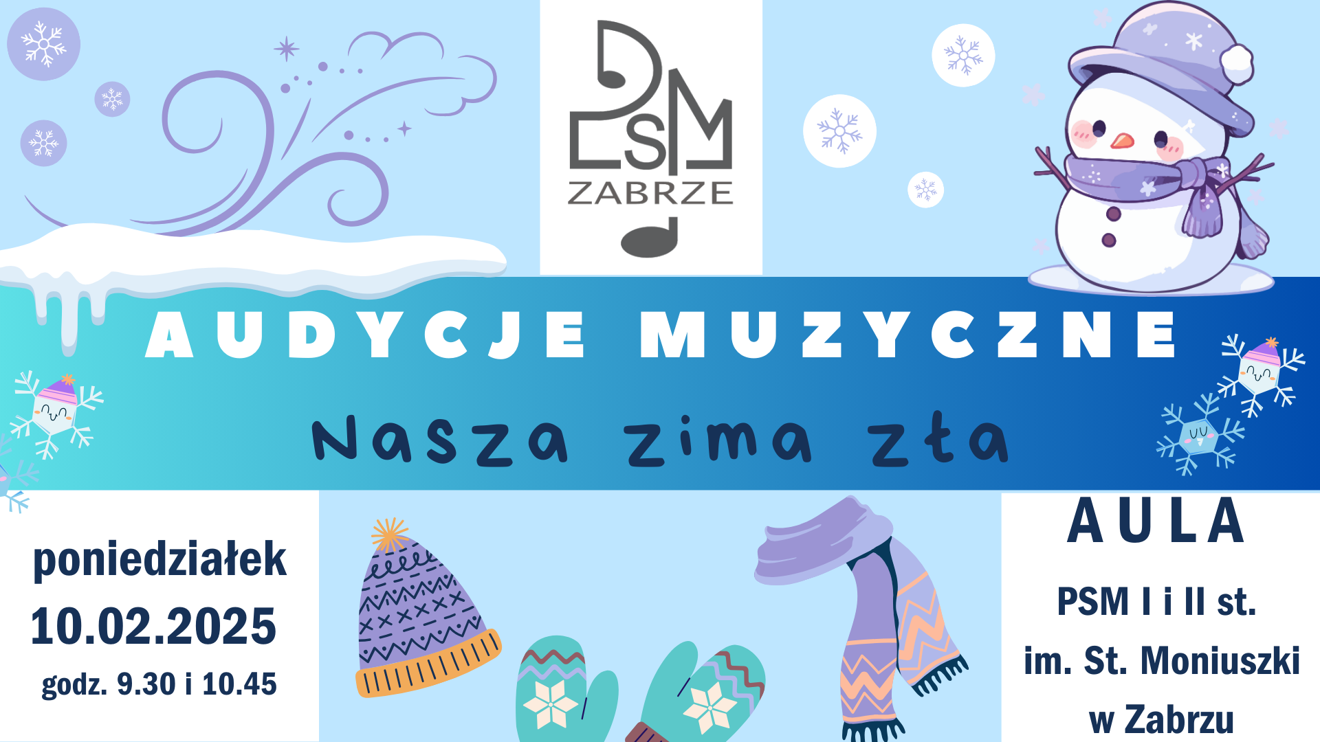 W poniedziałek, 10 lutego br. o godz. 9:30 i 10:45 odbędą się kolejne w tym roku kalendarzowym audycje muzyczne pt. Nasza zima zła. Zapraszamy grupy szkolno-przedszkolne, które zarezerwowały wstęp.
