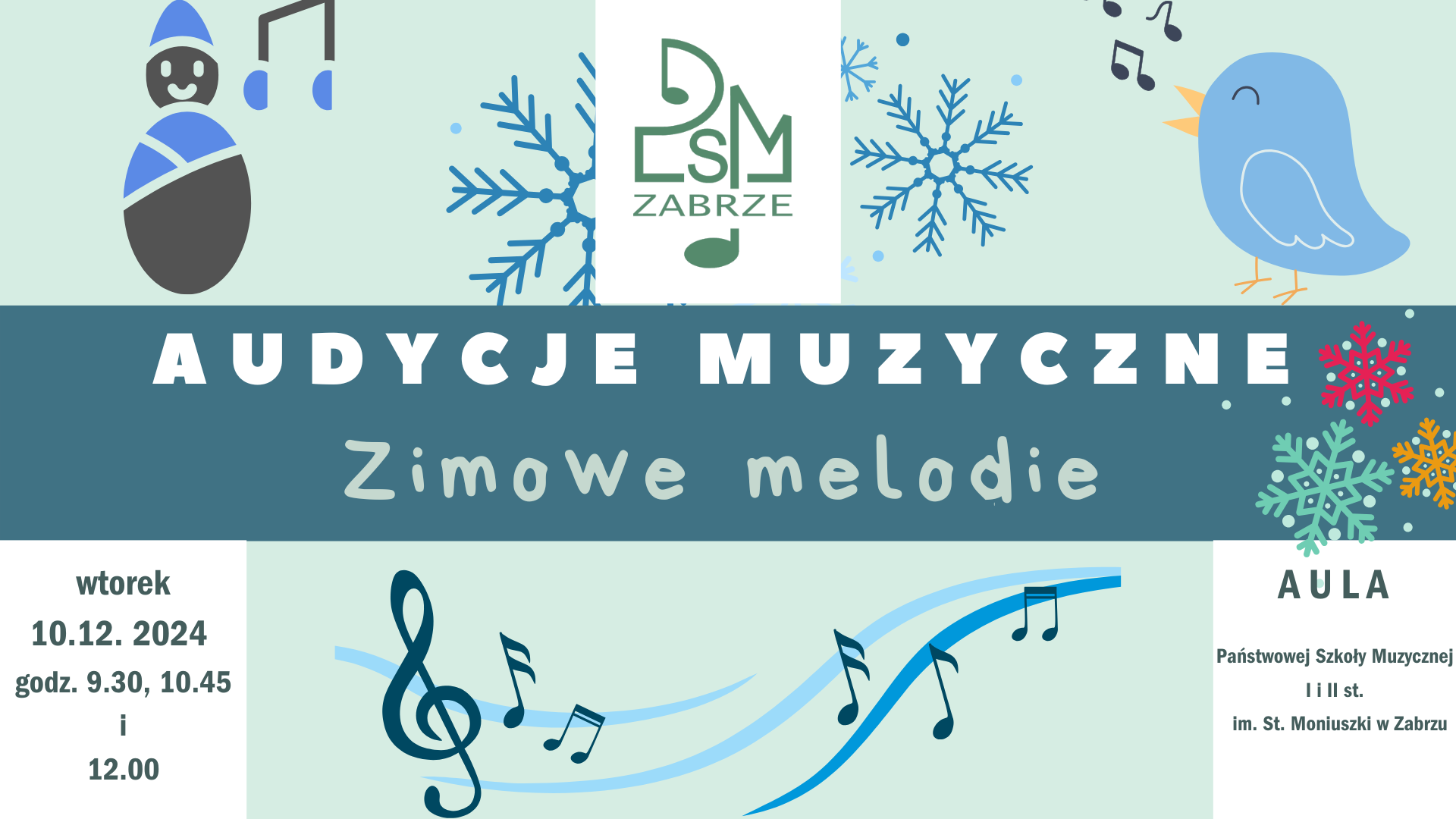 We wtorek, 10 grudnia br. o godz. 9:30 i 10:45 odbędą się kolejne audycje muzyczne pt. Zimowe melodie. Zapraszamy grupy szkolno-przedszkolne, które zarezerwowały wstęp. O godzinie12:00 odbędzie się występ naszych uczniów dla Seniorów ze Stowarzyszenia Pogodni i Aktywni , do których kierujemy szczególne zaproszenie! Do zobaczenia!