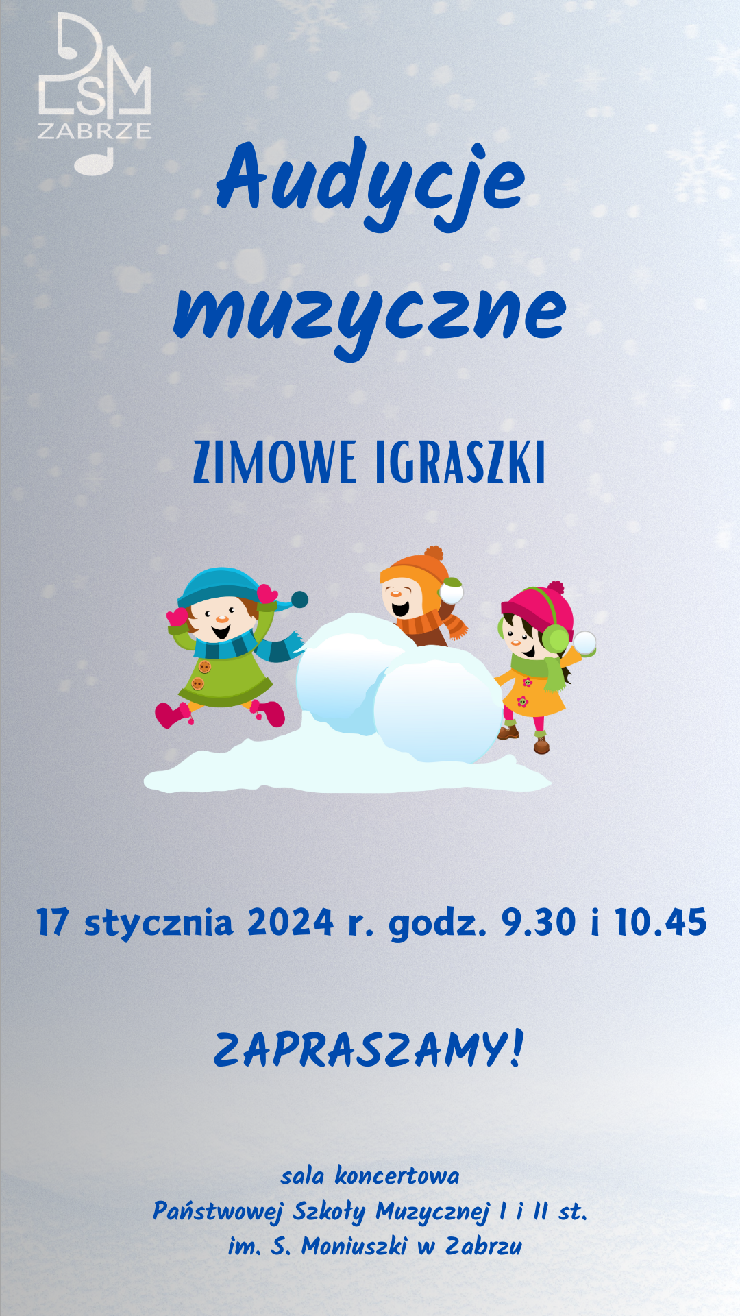 W środę, 17 stycznia br. o godz. 9:30 i 10:45 odbędą się kolejne audycje muzyczne pt. Zimowe igraszaki. Zapraszamy grupy szkolno-przedszkolne, które zarezerwowały wstęp.