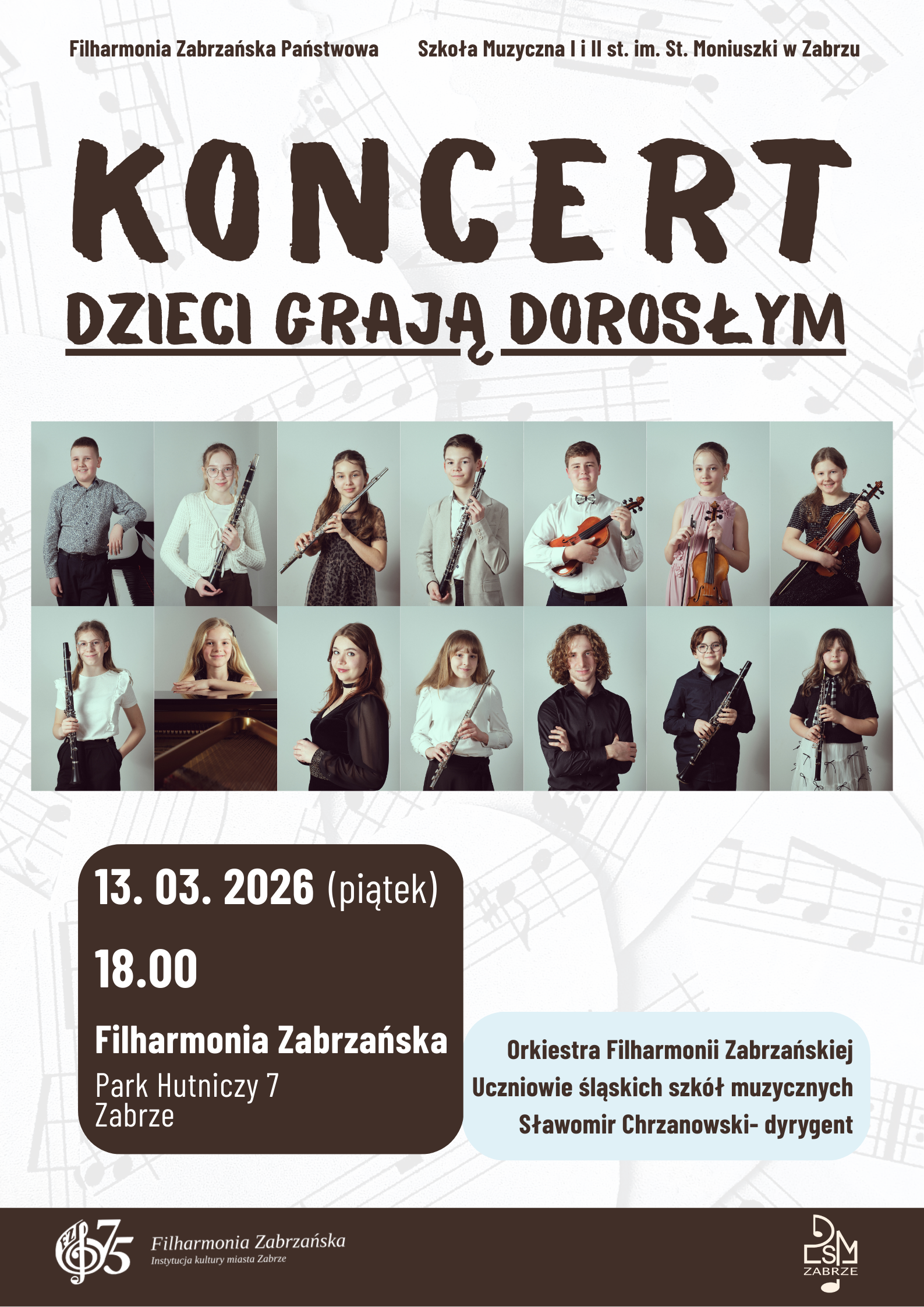 Serdecznie zapraszamy na Koncert Dzieci Grają Dorosłym w wykonaniu uczniów naszej szkoły z towarzyszeniem orkiestry symfonicznej Filharmonii Zabrzańskiej pod dyrekcją Sławomira Chrzanowskiego. Koncert odbędzie się w piątek 13 marca 2026 roku o godz. 18:00 w siedzibie Filharmonii. Bilety można nabyć w kasie Filharmonii Zabrzańskiej ul. Park Hutniczy 7