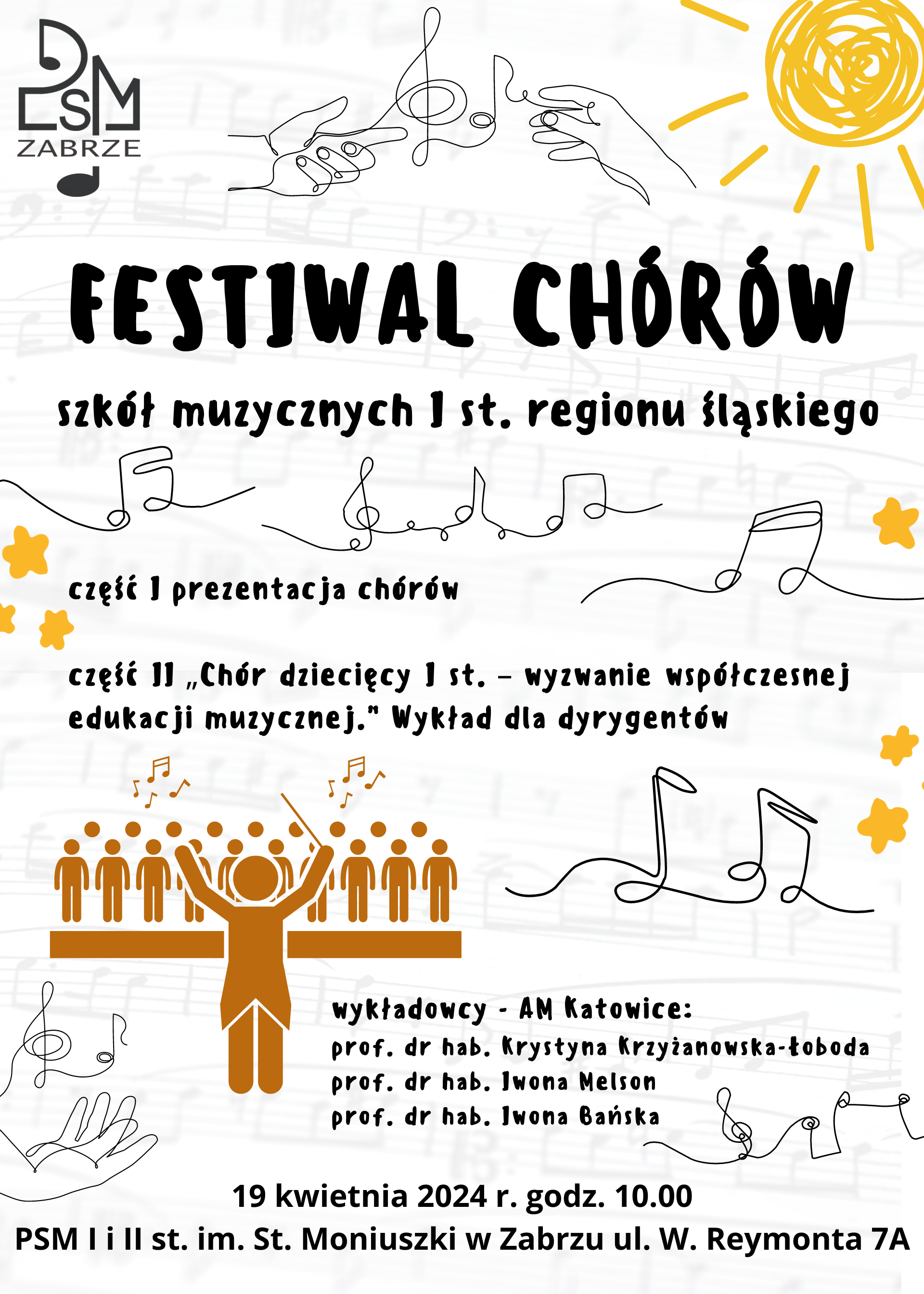 W piątek, 19 kwietnia 2024 roku w naszej szkole odbędzie FESTIWAL CHÓRÓW szkół muzycznych I stopnia regionu śląskiego. Zaczynamy o godzinie 10.00 od występu chóru szkoły muzycznej I stopnia w Zabrzu. Dzień ten dla naszych uczniów jest dniem wolnym od zajęć dydaktyczno-wychowawczych.