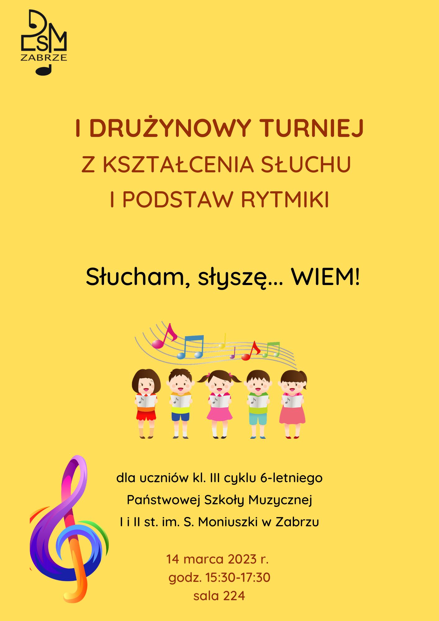 Dnia 14 marca 2023r. o godz. 15:30 w sali 224 odbędzie się I-szy Drużynowy Turniej z kształcenia słuchu i podstaw rytmiki "Słucham, słyszę... WIEM!" dla uczniów kl. III cyklu 6-letniego.