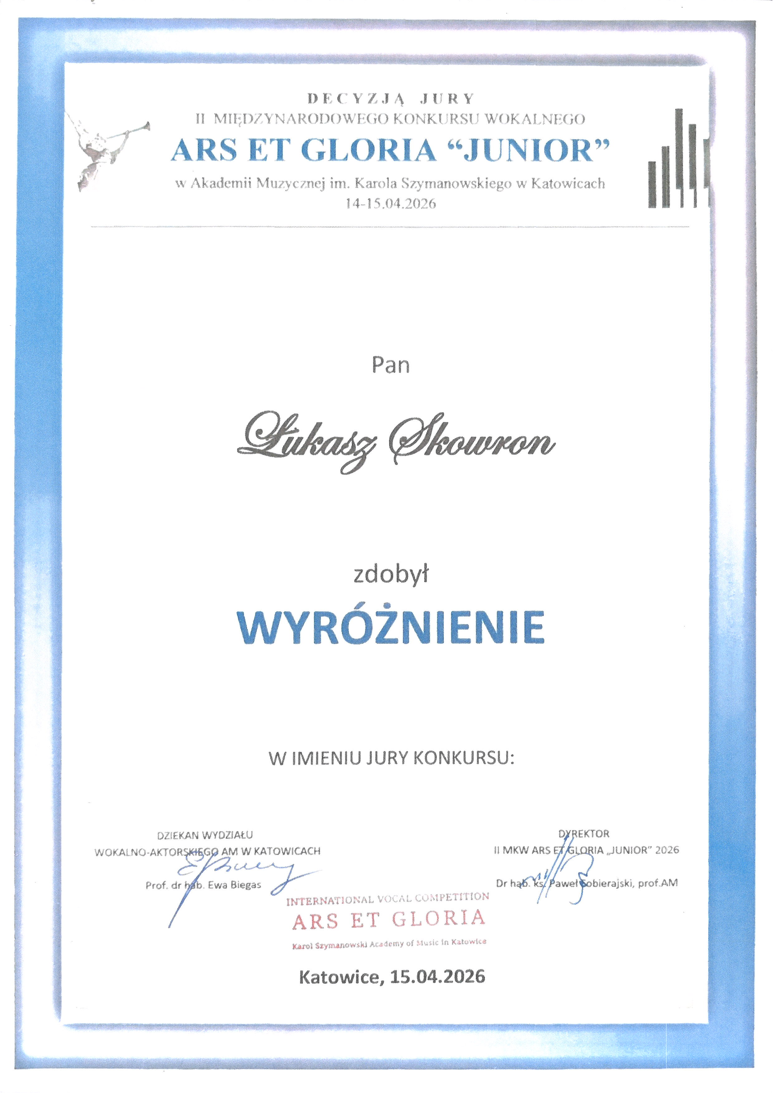 Z wielką przyjemnością informujemy, że podczas II Międzynarodowego Konkursu Woklanego "ARS ET GLORIA JUNIOR", który odbył się w Katowicach w dniu 15 kwietnia 2026 roku, Łukasz Skowron z klasy śpiewu Pani Małgorzaty Strąg zdobył wyróżnienie. Uczniowi akompaniowała Pani Halina Mansarlińska.