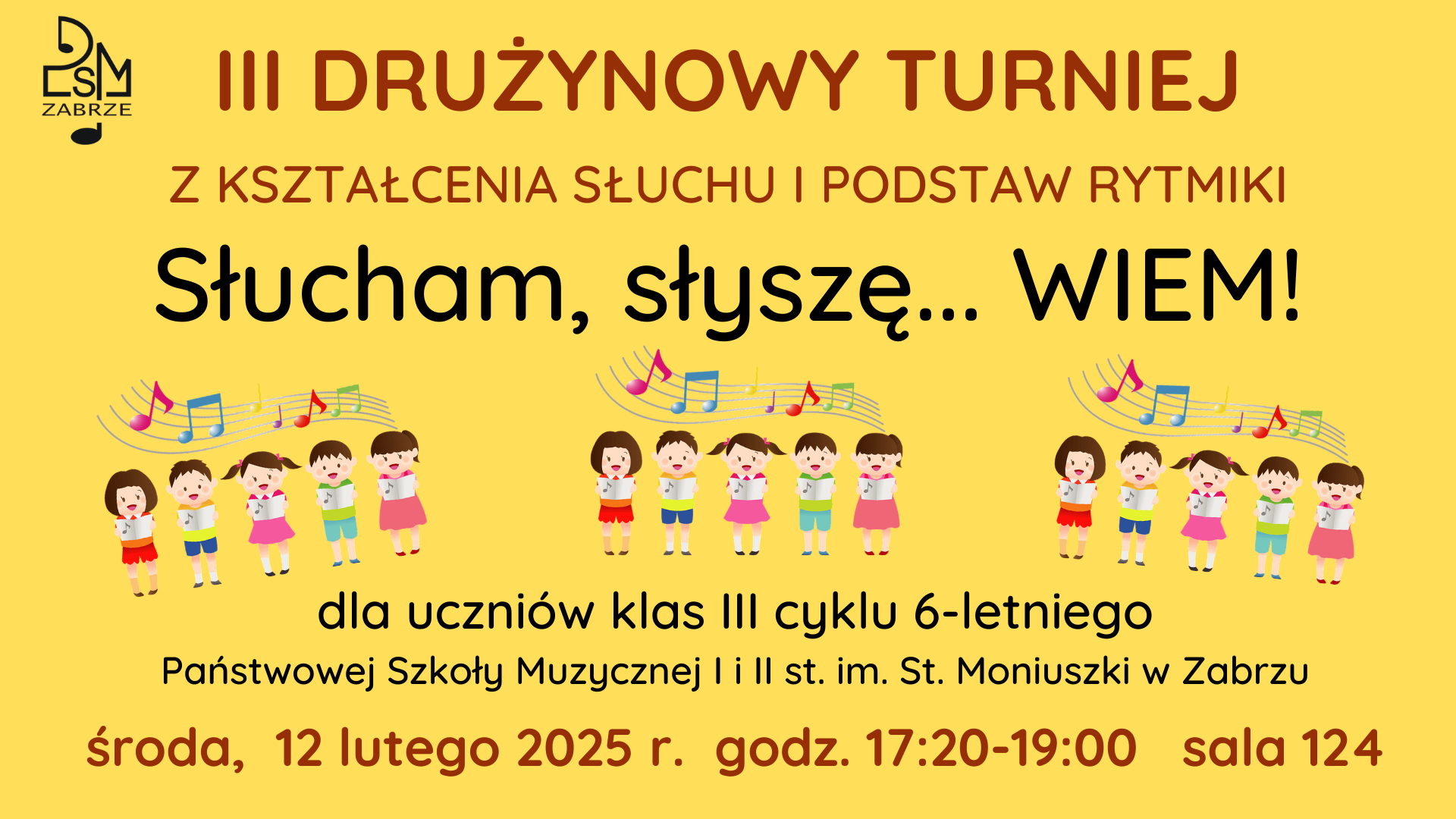 W środę 12 lutego 2025 roku w godzinach 17.20-19.00 w sali 124 odbędzie się III Drużynowy Turniej z Kształcenia Słuchu i Podstaw Rytmiki Słucham, słyszę...WIEM. Serdecznie zapraszamy do udziału wszystkich uczniów klas III cyklu 6-letniego szkoły I stopnia :-)