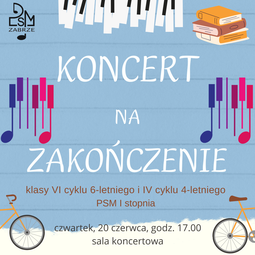 Wszystkich uczniów klas VI cyklu 6-letniego i IV cyklu 4-letniego szkoły muzycznej I stopnia serdecznie zapraszamy w czwartek, 20 czerwca br. na godzinę 17.00 do sali koncertowej naszej szkoły. Prosimy o strój galowy, gdyż przewidziane jest wspólne pamiątkowe zdjęcie, a po nim KONCERT NA ZAKOŃCZENIE. Po koncercie - KOMERS w szkolnej świetlicy.