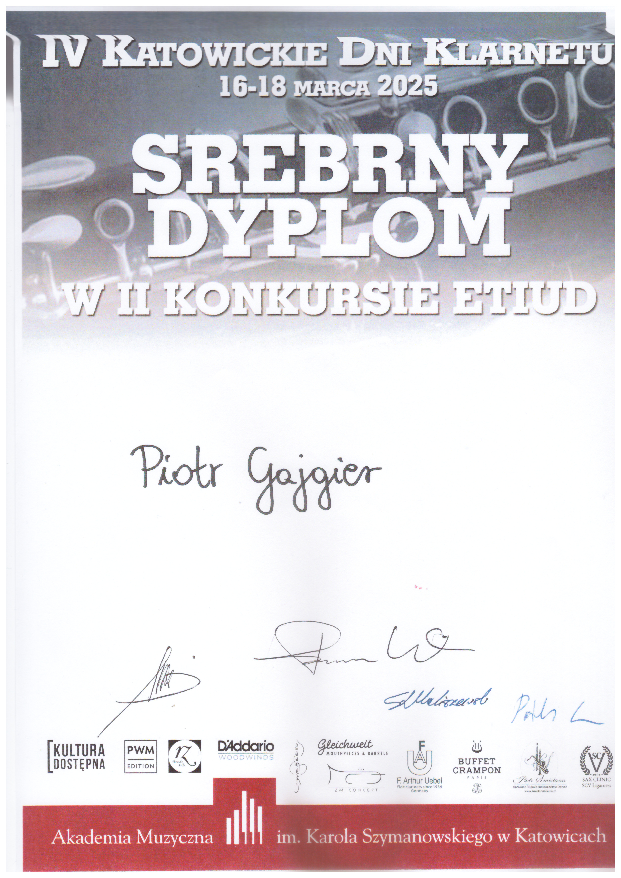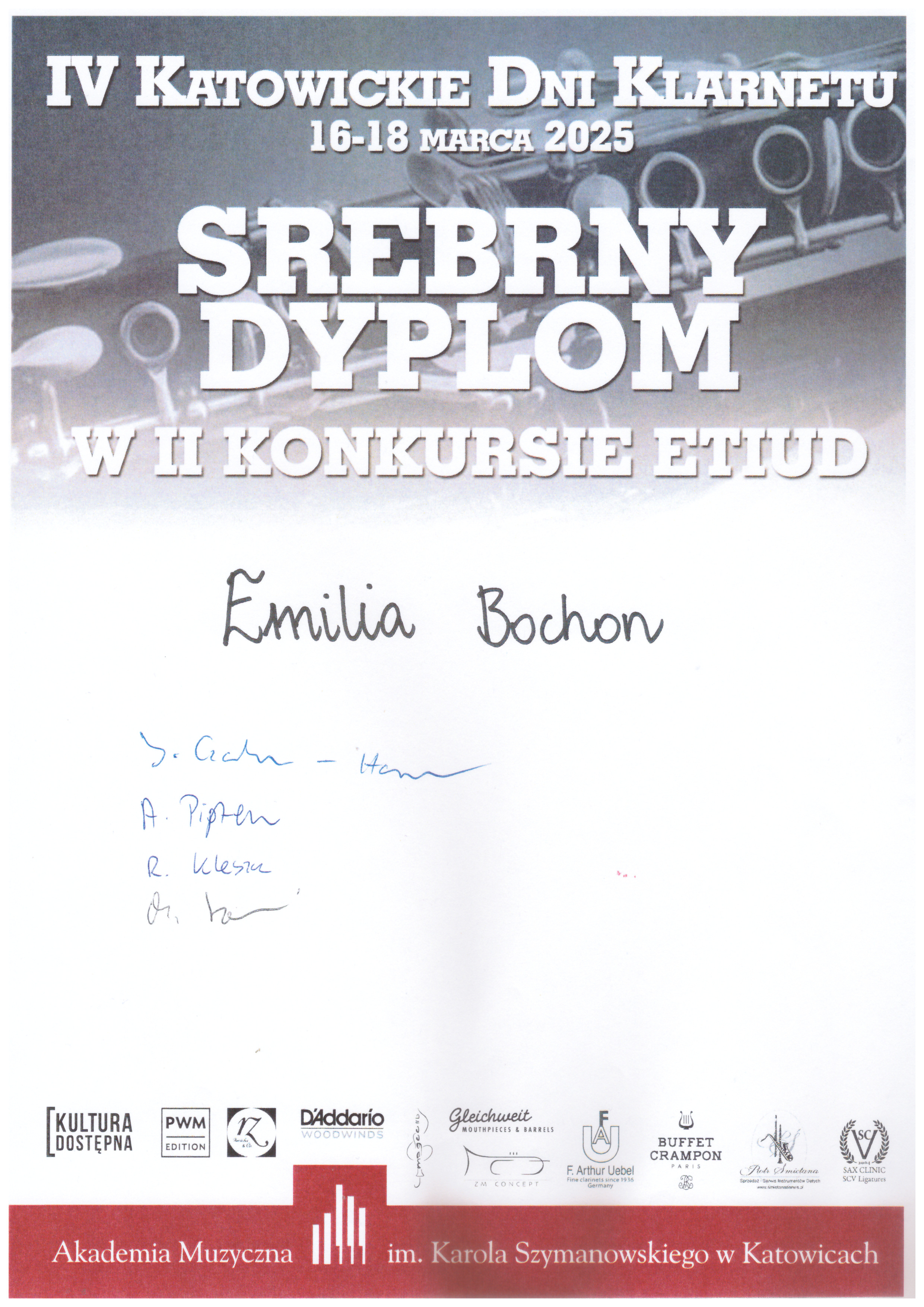 Informujemy, że Emilia Bochon oraz Piotr Gajgier zdobyli Srebrny Dyplom w II Konkursie Etiud podczas IV Katowickich Dni Klarnetu w Katowicach. Gratulujemy sukcesu i dziękujemy Panu Dariuszowi Kasperkowi za przygotowanie naszych laureatów.