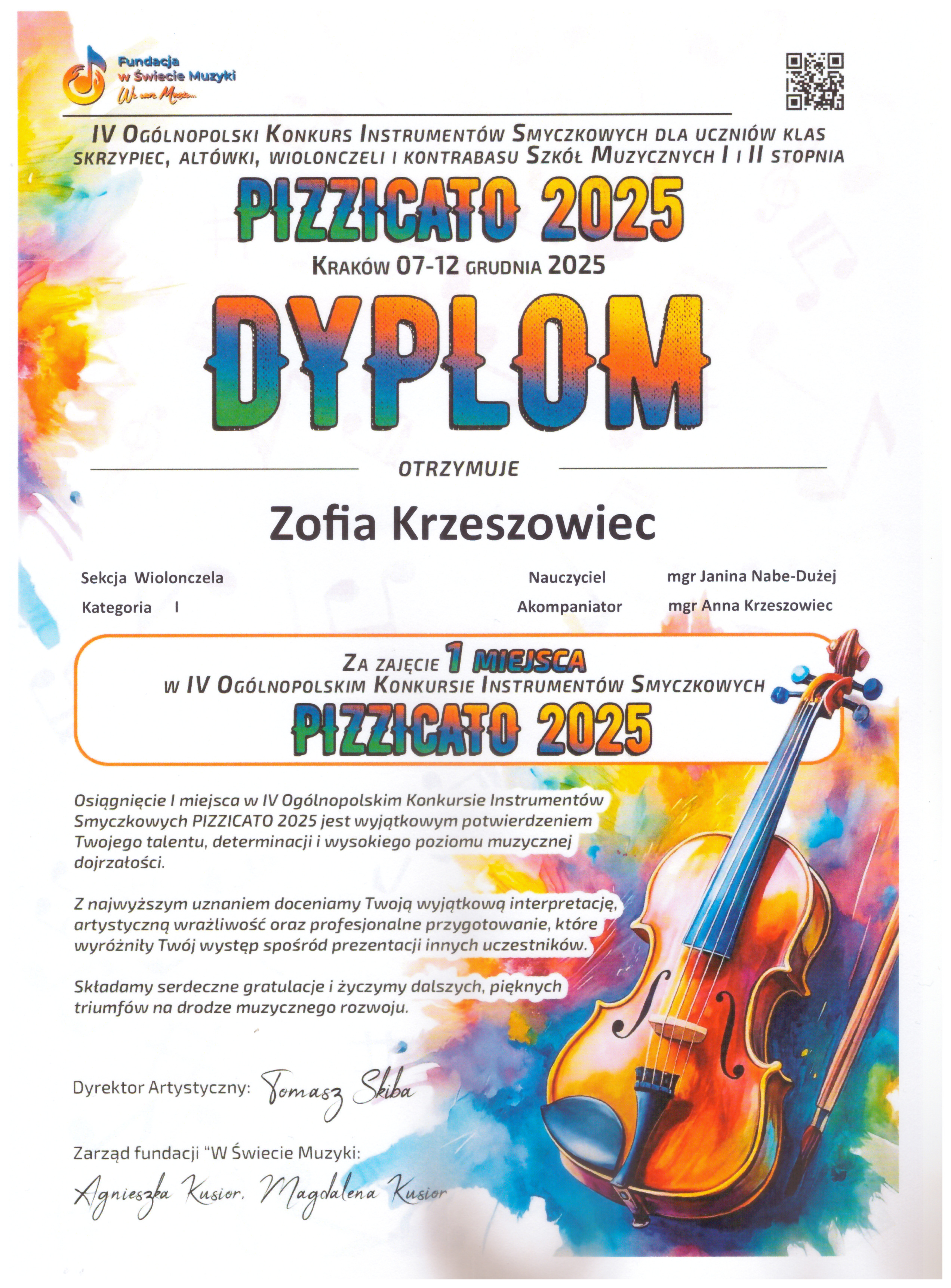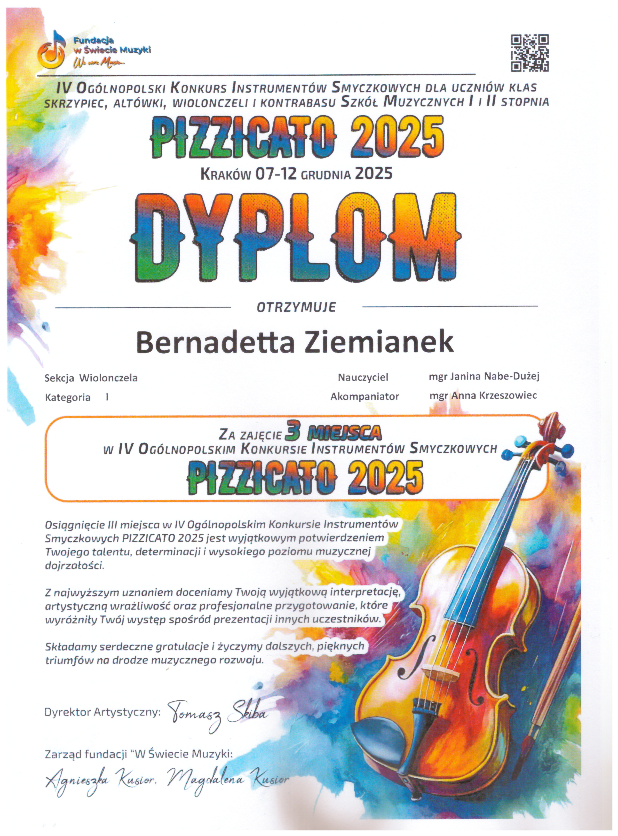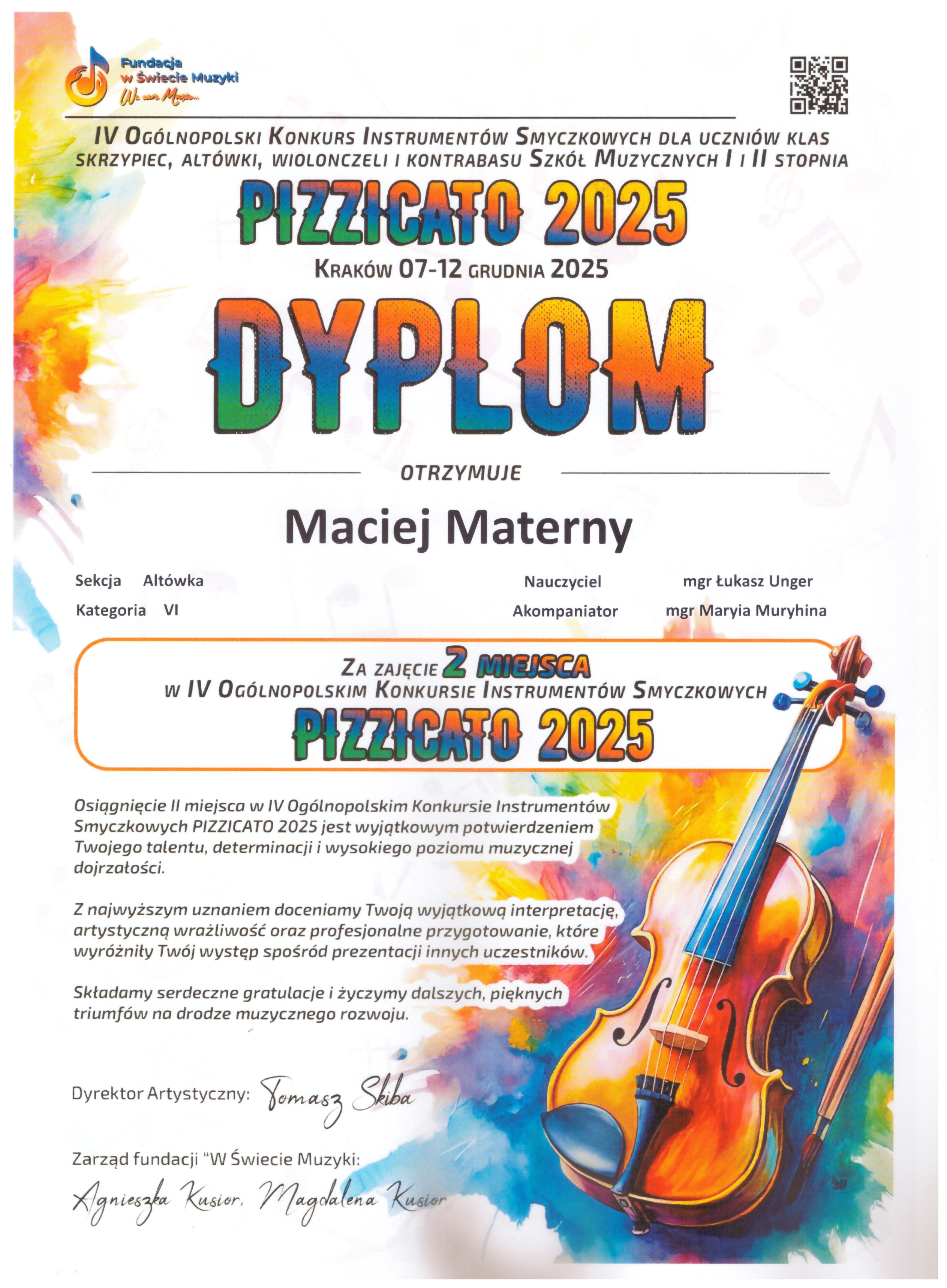 Z wielką przyjemnością informujemy, że w IV Ogólnopolskim Konkursie Instrumentów Smyczkowych ,,Pizzicato” dla uczniów Szkół Muzycznych I i II stopnia organizowanych przez Fundację ,,W Świecie Muzyki", który odbył się w Krakowie w dniach 07-12 grudnia 2025 r. w formule "online" laury zdobyli następujący uczniowie: