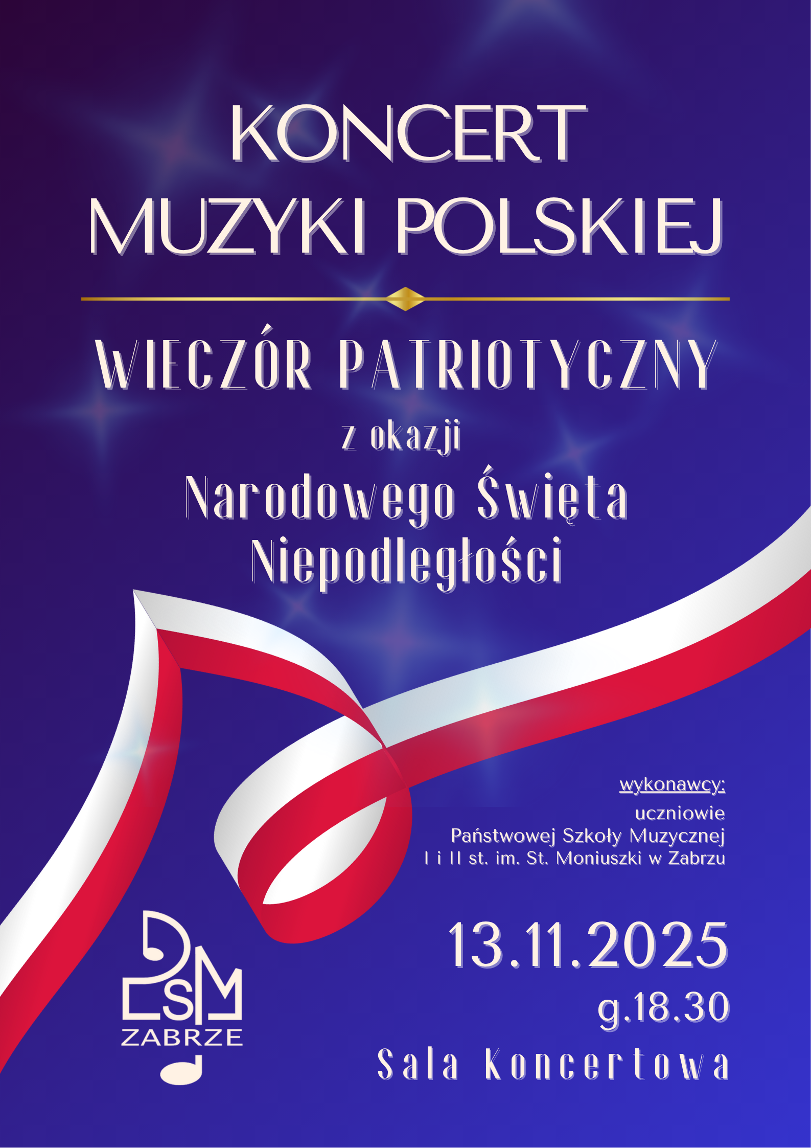 Serdecznie zapraszamy na KONCERT MUZYKI POLSKIEJ - WIECZÓR PATRIOTYCZNY z okazji Narodowego Święta Niepodległości w wykonaniu uczniów naszej szkoły. Koncert odbędzie się w czwartek, 13 listopada br. o godz. 18.30 w Sali Koncertowej.