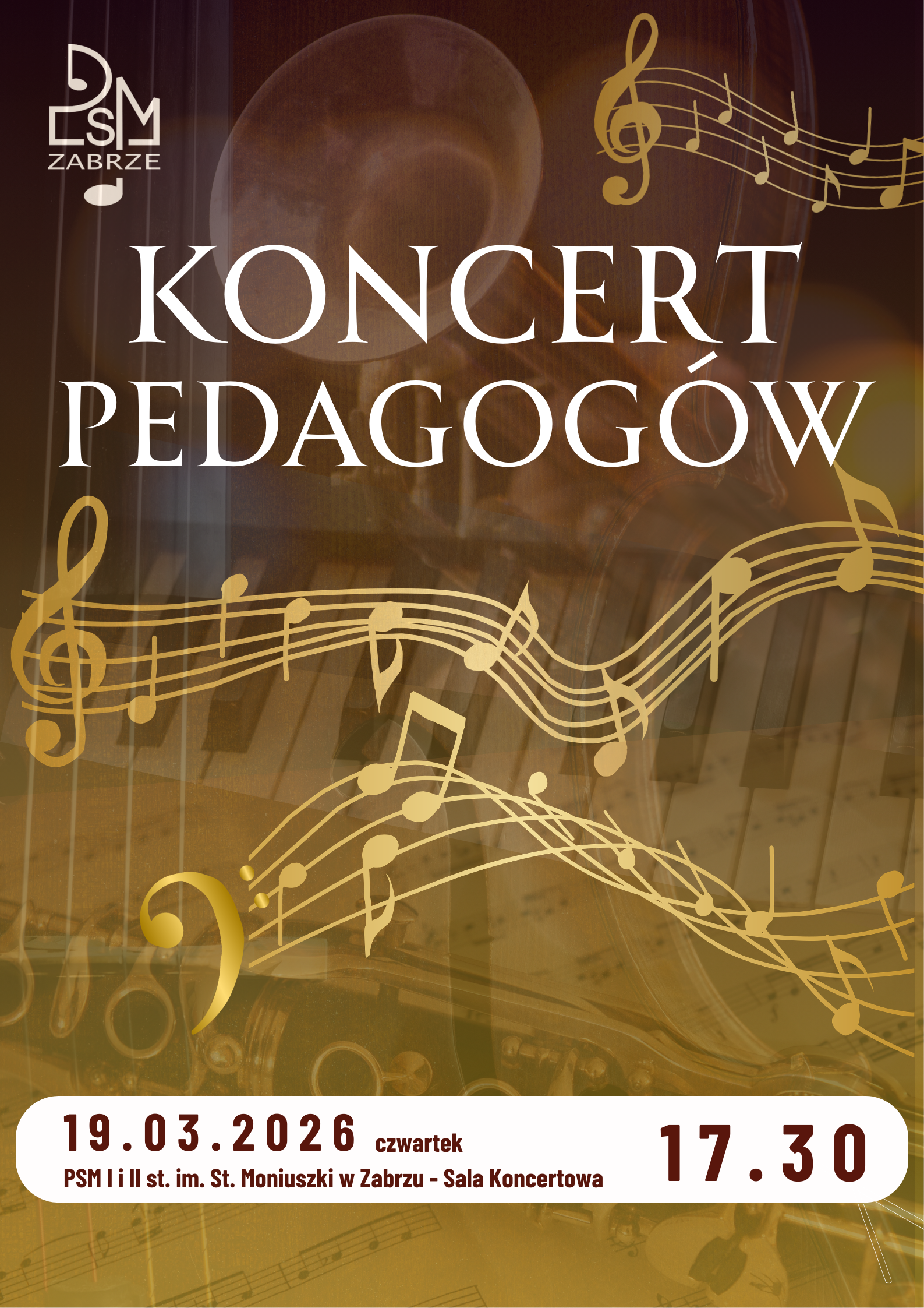 W czwartek, 19 marca 2026 roku o godzinie 17.30 w Sali Koncertowej odbędzie się KONCERT PEDAGOGÓW Państwowej Szkoły Muzycznej I i II stopnia im. St. Moniuszki w Zabrzu. Serdecznie zapraszamy!