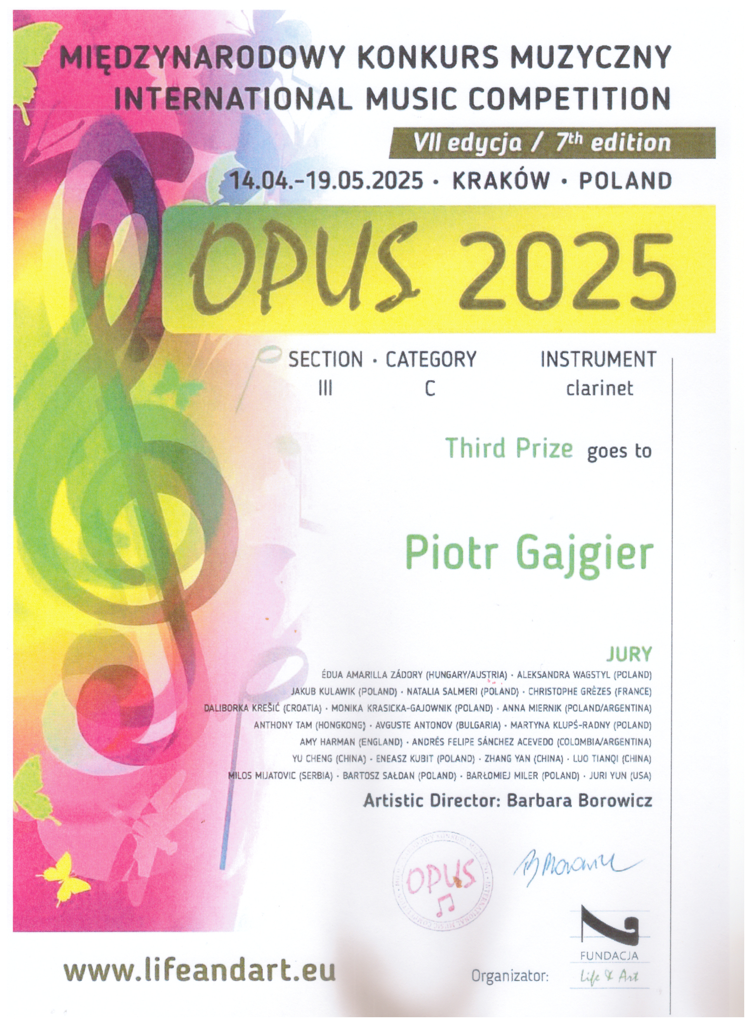 Informujemy, że Piotr Gajgier zdobył III miejsce w sekcji III kategorii C w Międzynarodowym Konkursie Muzycznym "OPUS" organizowanym w dn. 14.04.-19.05.2025 w Krakowie. Gratulujemy sukcesu i dziękujemy Panu Dariuszowi Kasperkowi za przygotowanie naszego laureata oraz Pani Muryhinie Maryi za akompaniament!