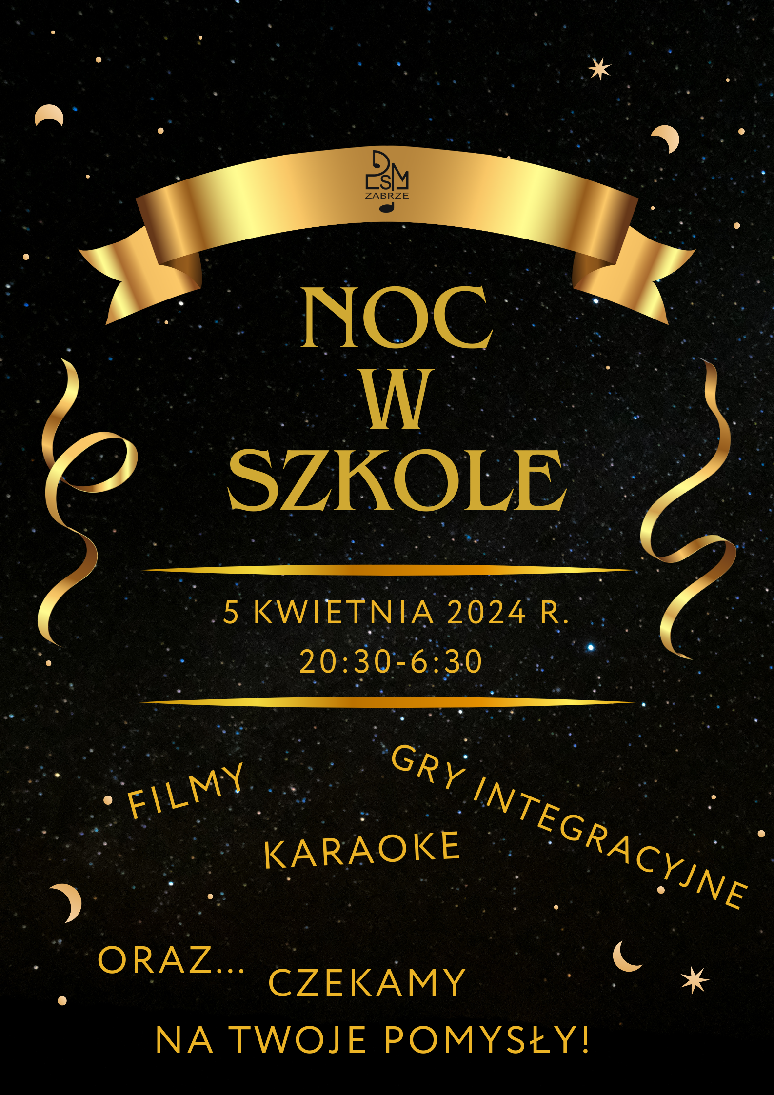 Chcesz zobaczyć ducha Stanisława Moniuszki? Posłuchać tajemniczego brzmienia kuranta ze Strasznego dworu? Już w najbliższym czasie z piątku na sobotę 5 - 6 kwietnia br. w godz. 20.30-6.30 odbędzie się pierwsza w historii NOC W SZKOLE! To wyjątkowe wydarzenie integrujące naszych uczniów klas IV-VI cyklu 6-letniego i II-IV cyklu 4-letniego szkoły muzycznej I stopnia oraz uczniów szkoły II stopnia będzie miało wiele odsłon. W programie przewidziano projekcje ciekawych filmów, gry, karaoke oraz wiele innych atrakcji i niespodzianek! Zabierz z sobą karimatę, ciepłe okrycie, poduszkę, drobne przekąski, napoje i ruszaj po przygodę! Czekamy!