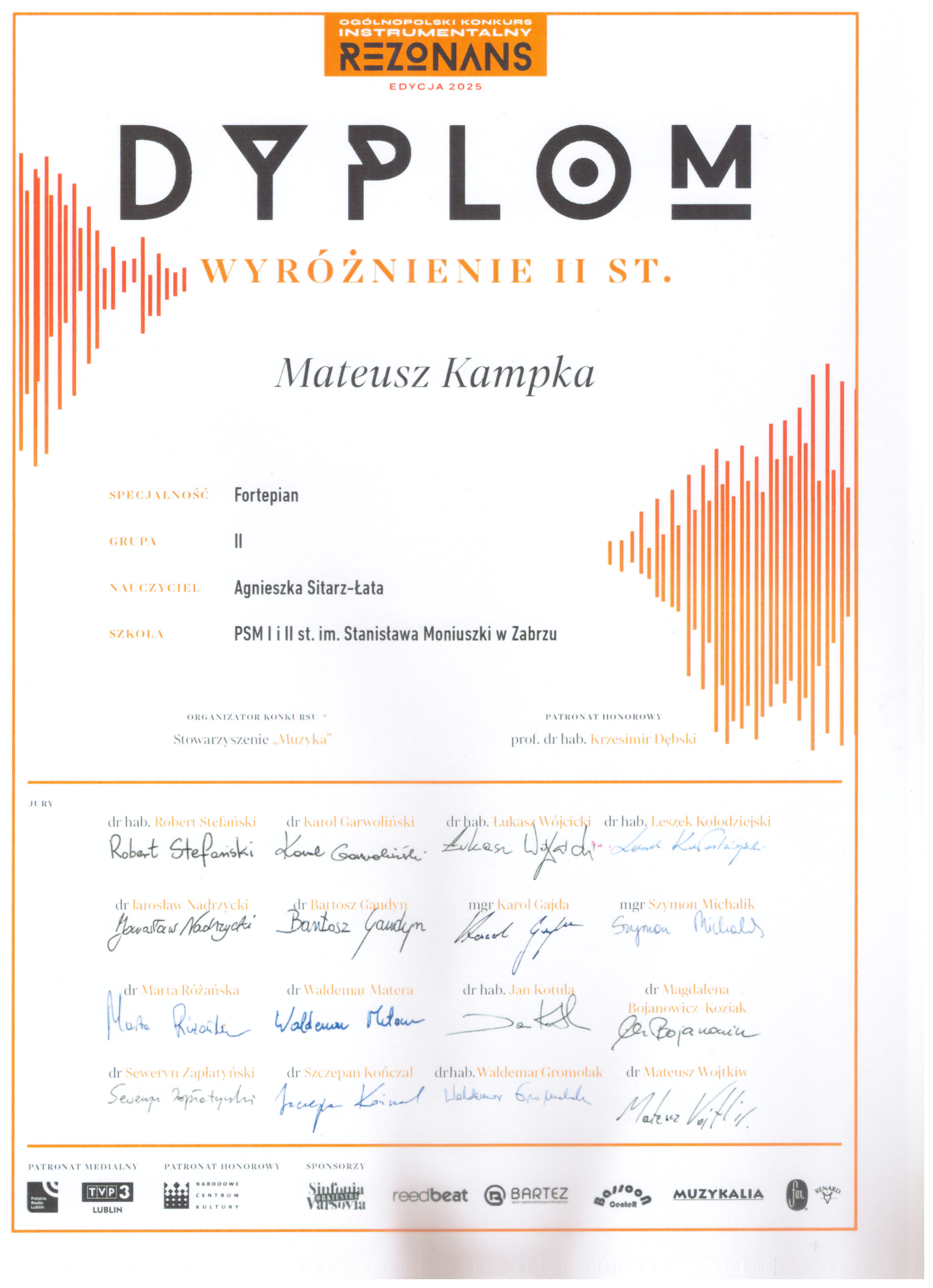 Informujemy, że Mateusz Kampka zdobył II st. w Ogólnopolskim Konkursie Instrumentalnym REZONANS. Gratulujemy sukcesu i dziękujemy Pani Agnieszce Sitarz-Łacie za przygotowanie naszego laureata!