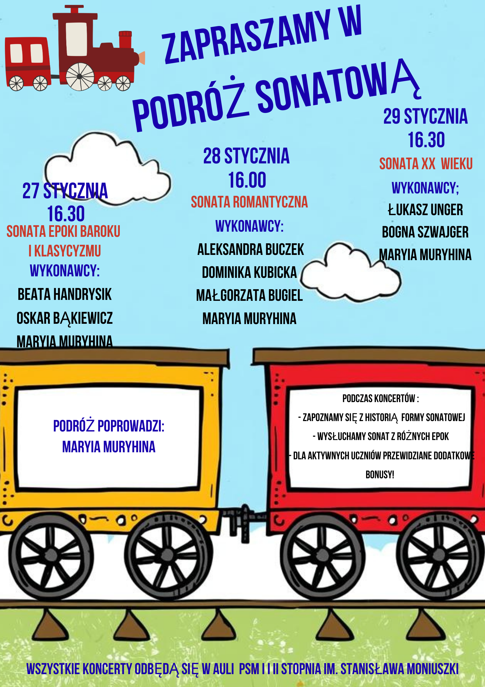 Serdecznie zapraszamy uczniów, rodziców oraz wszystkich miłośników muzyki na wyjątkową PODRÓŻ SONATOWĄ PRZEZ WIEKI – cykl koncertów, który w przystępny i inspirujący sposób poprowadzi słuchaczy przez różne epoki muzyczne, odkrywając piękno i historię formy sonatowej. To spotkanie z muzyką, które łączy edukację z radością wspólnego przeżywania sztuki.