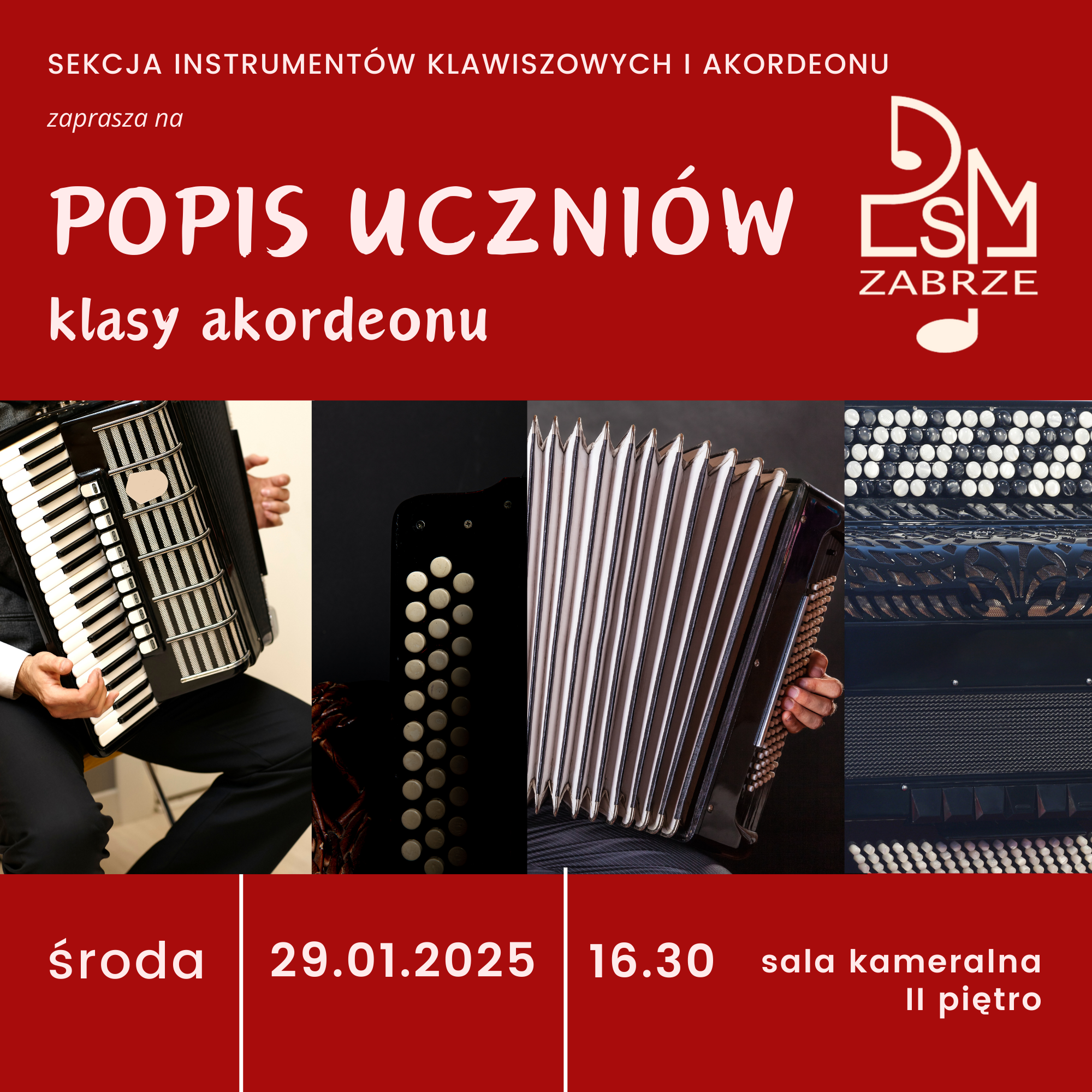 W środę, 29 stycznia br. o godz. 16.30 odbędzie się popis akordeonistów szkoły muzycznej I i II stopnia. Zapraszamy do sali kameralnej na II piętrze.