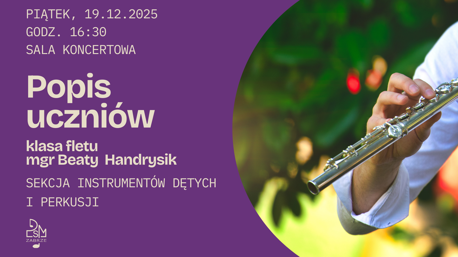 W piątek, 19 grudnia br. odbędzie się ostatni w tym roku kalendarzowym popis uczniów. O godzinie 16.30 w Sali Koncertowej zagrają uczniowie klasy fletu mgr Beaty Handrysik.