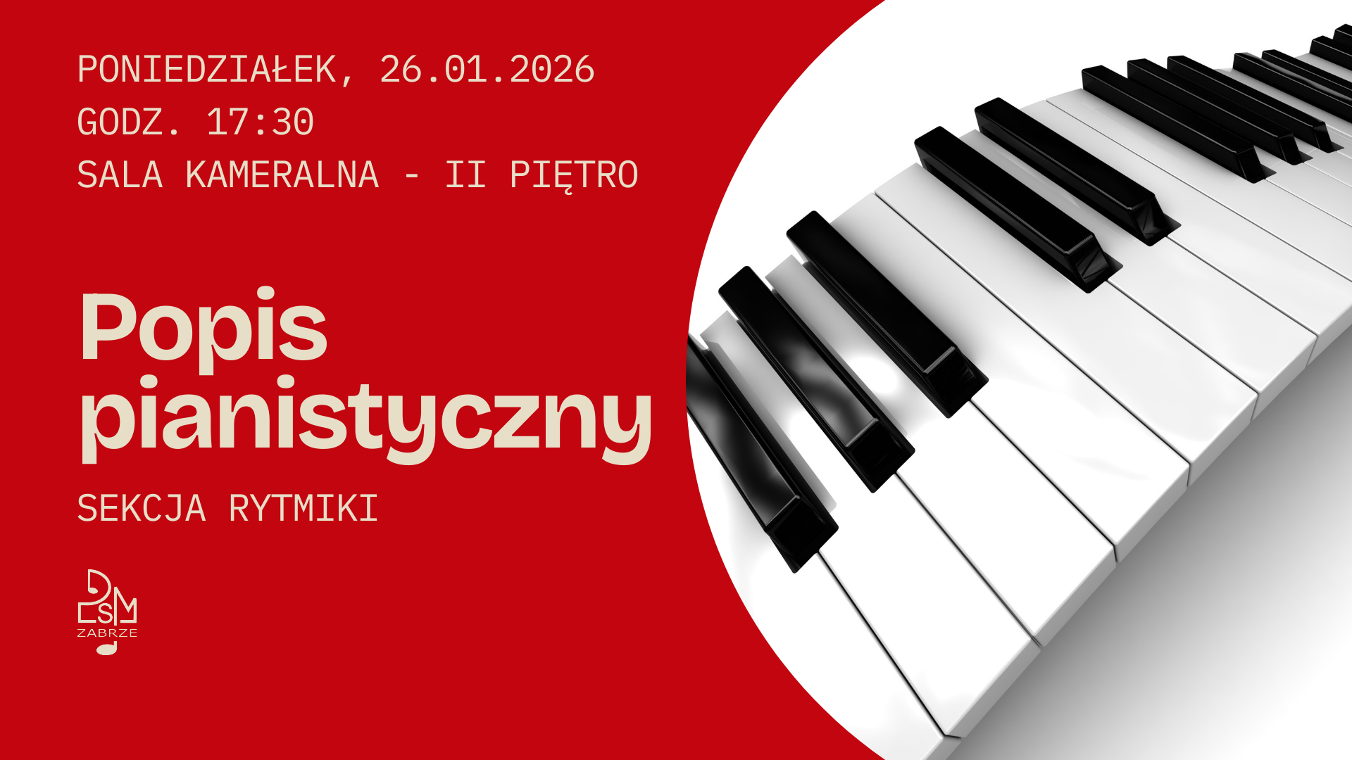 Serdecznie zapraszamy na popis pianistyczny uczniów specjalności rytmika. Popis odbędzie się w poniedziałek, 26 stycznia o godzinie 17.30 w sali kameralnej na II piętrze.
