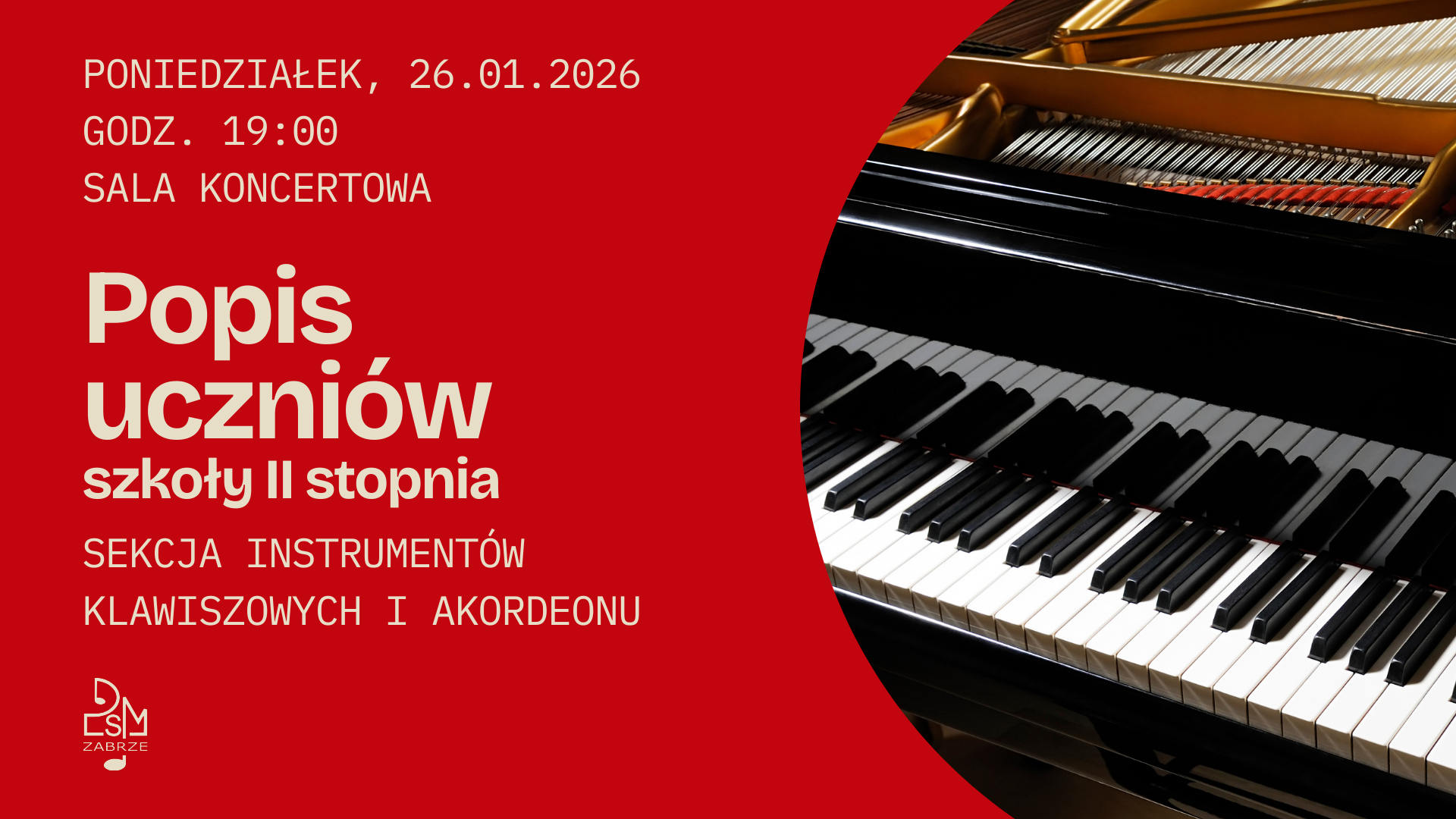 Serdecznie zapraszamy na popis uczniów sekcji instrumentów klawiszowych i akordeonu szkoły muzycznej II stopnia. Popis odbędzie się w środę, 26 stycznia o godzinie 19.00 w Sali Koncertowej.