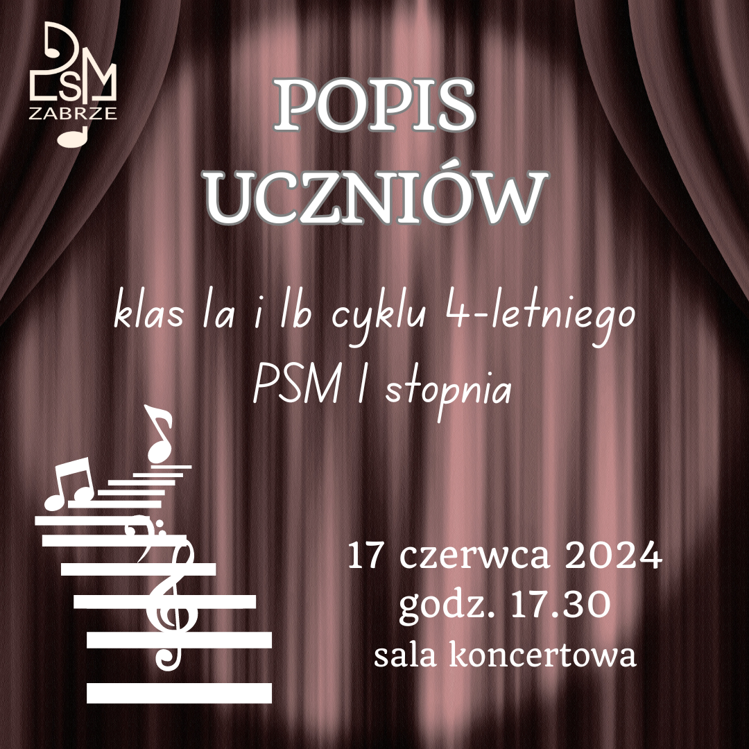 W poniedziałek 17.06.2024 roku o godzinie 17.30 w sali koncertowej odbędzie się popis uczniów klas Ia i Ib cyklu 4-letniego. Serdecznie zapraszamy!