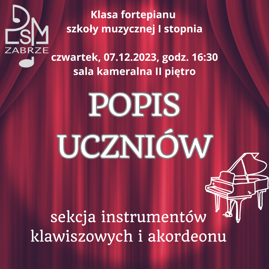 W czwartek, 7 grudnia 2023 r. o godzinie 16.30 w sali kameralnej na II piętrze odbędzie się kolejny w tym roku szkolnym popis uczniów klasy fortepianu szkoły muzycznej I stopnia. Serdecznie zapraszamy!