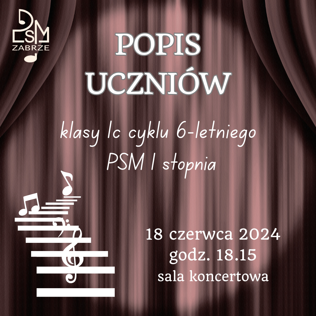We wtorek 18.06.2024 roku o godz. 18.15 w sali koncertowej odbędzie się popis uczniów klasy Ic cyklu 6-letniego. Serdecznie zapraszamy!