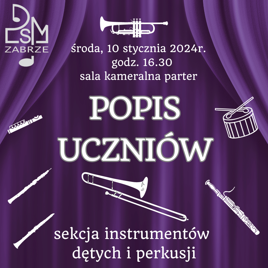 W środę, 10 stycznia 2024 roku o godz. 16:30 w sali kameralnej na parterze odbędzie się kolejny w tym roku szkolnym popis uczniów sekcji instrumentów dętych i perkusji. Serdecznie zapraszamy!