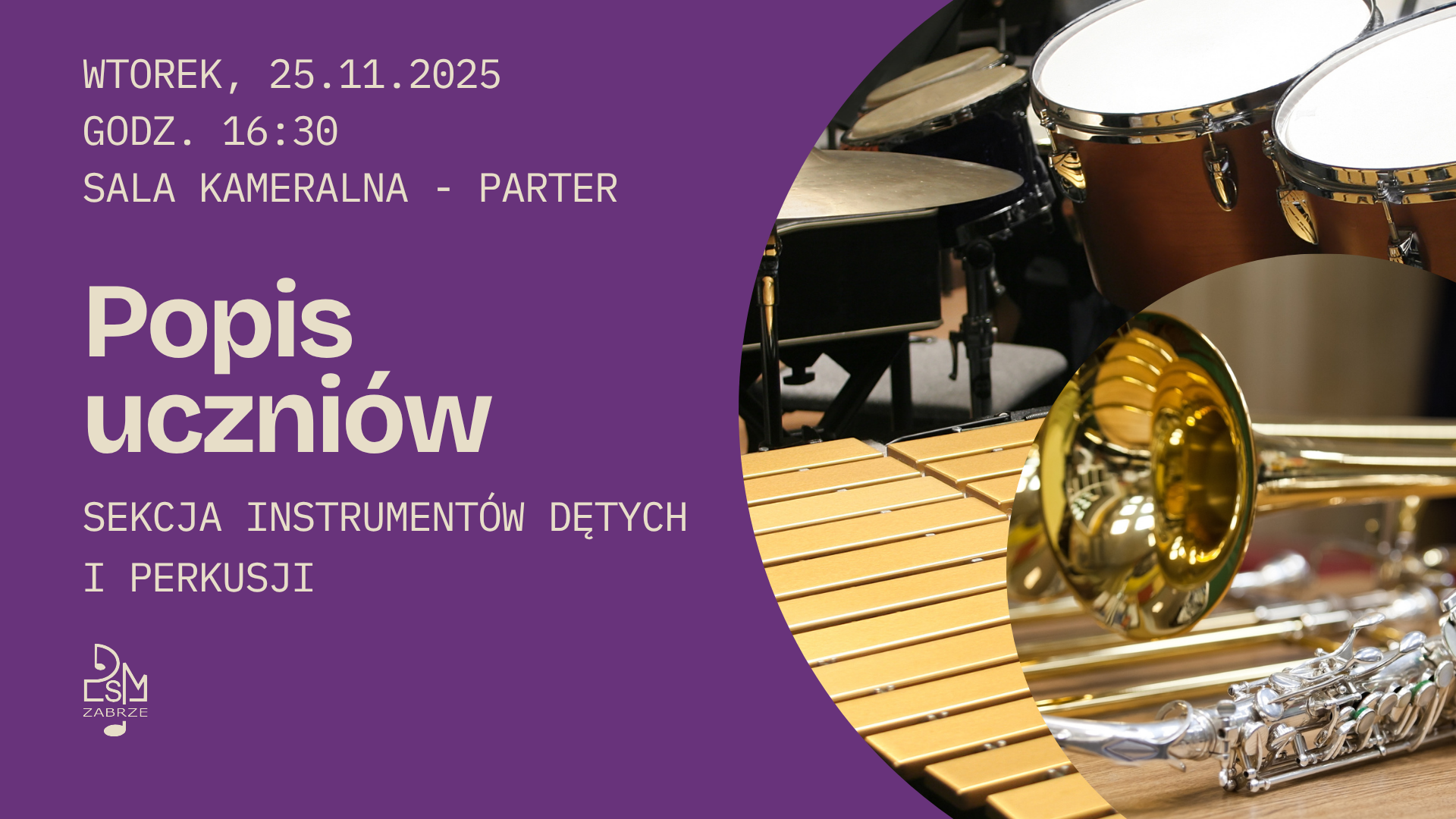 Serdecznie zapraszamy na popis uczniów sekcji instrumentów dętych i perkusji, który odbędzie się we wtorek, 25 listopada br. o godz. 16.30 w sali kameralnej na parterze.