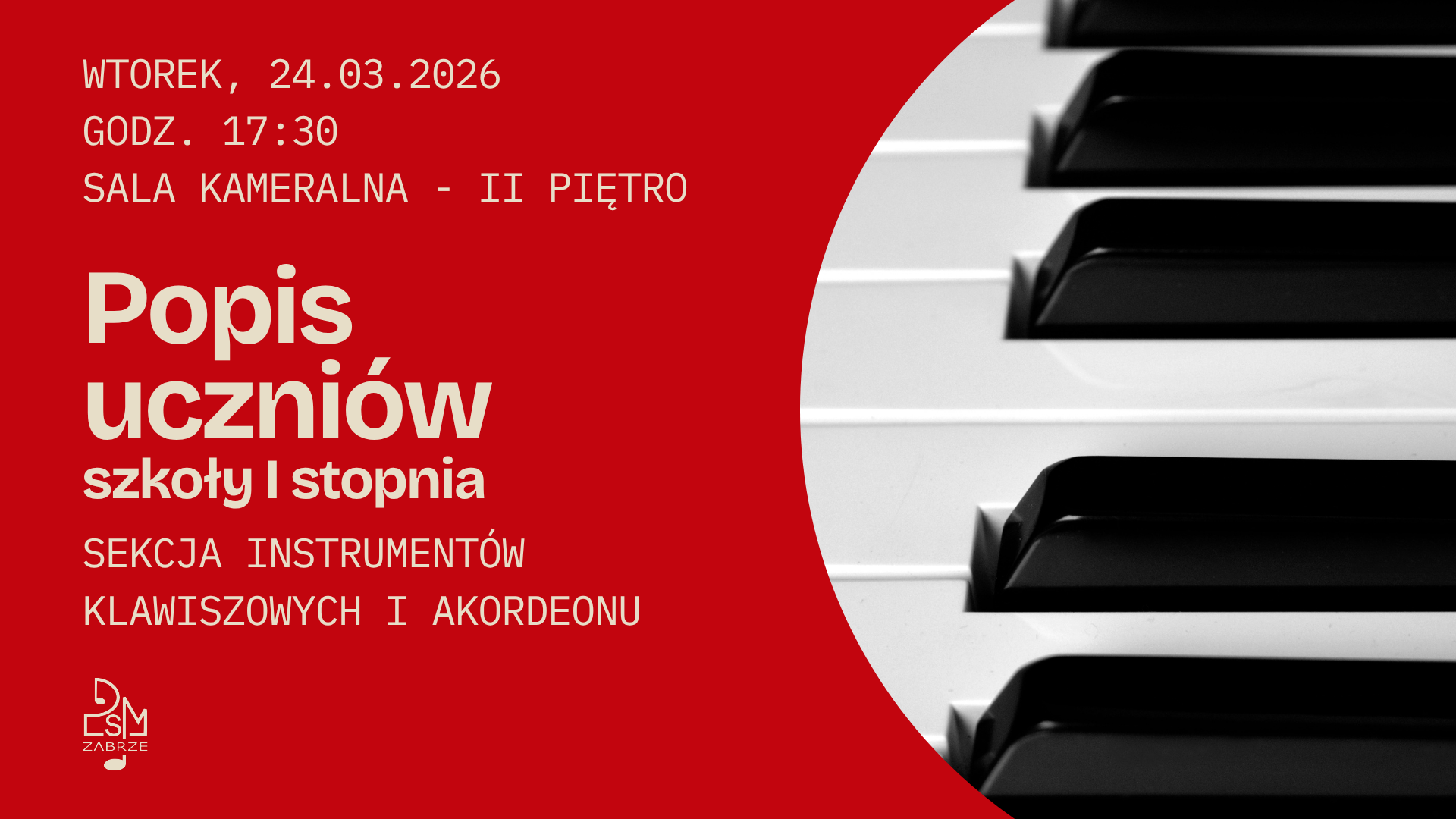 Serdecznie zapraszamy na popis uczniów sekcji instrumentów klawiszowych i akordeonu szkoły muzycznej I stopnia. Popis odbędzie się we wtorek, 24 marca o godzinie 17.30 w sali kameralnej na II piętrze.