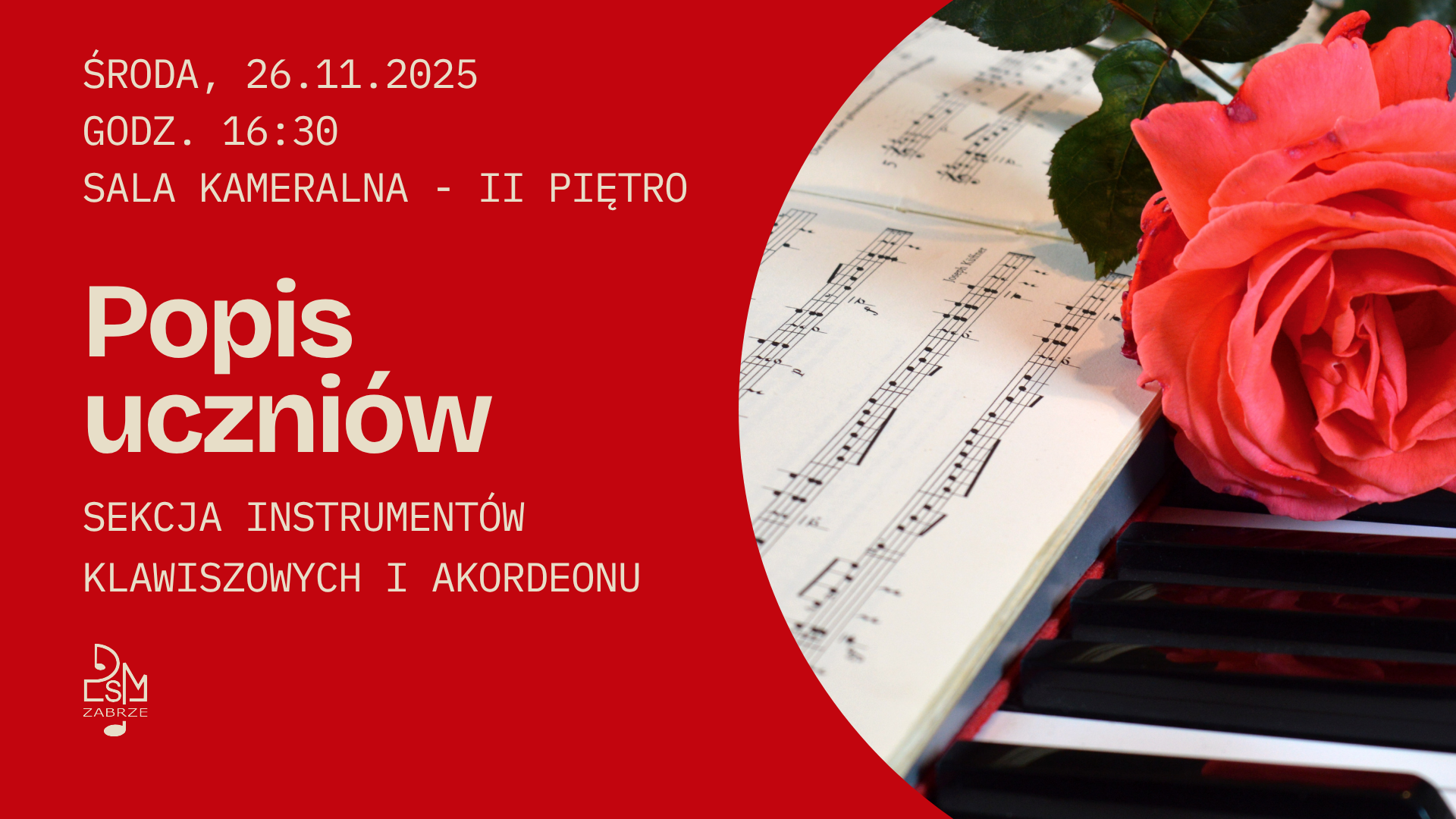 Serdecznie zapraszamy na popis uczniów sekcji instrumentów klawiszowych i akordeonu szkoły muzycznej I stopnia. Popis odbędzie się w środę, 26 listopada o godzinie 16.30 w sali kameralnej na II piętrze.