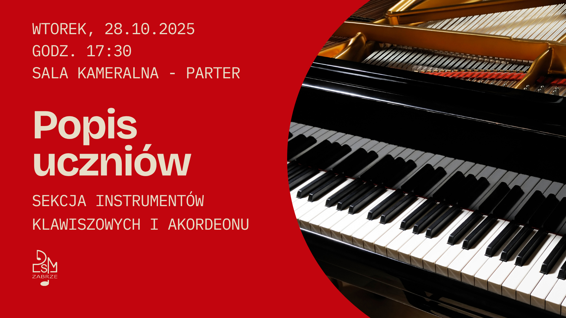 Serdecznie zapraszamy na pierwszy w tym roku szkolnym popis uczniów szkoły muzycznej I stopnia sekcji instrumentów klawiszowych i akordeonu. Popis odbędzie się we wtorek, 28 października o godzinie 17.30 w sali kameralnej na parterze.