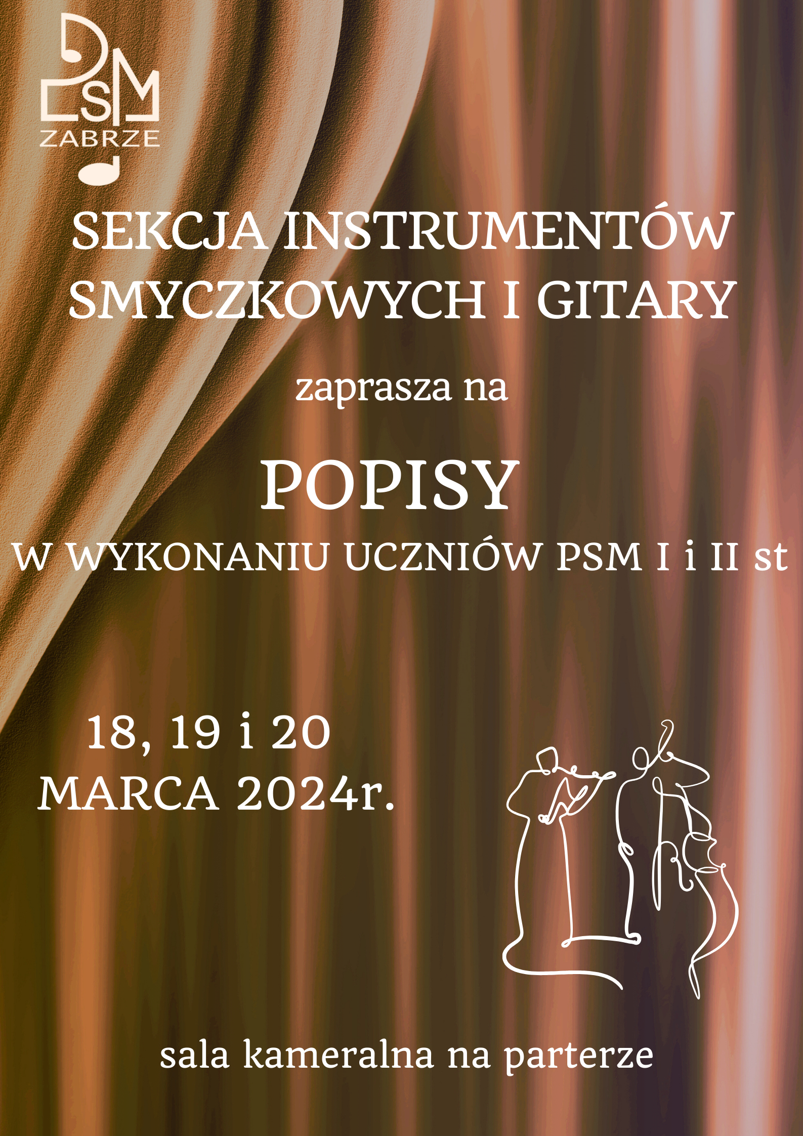 W poniedziałek i wtorek 18 i 19 marca o godzinie 16.30 w sali kameralnej na parterze oraz w środę 20 marca o godzinie 17.30 w sali kameralnej na II pietrze odbędą się kolejne w tym roku szkolnym popisy uczniów klas skrzypiec, altówki, wiolonczeli i kontrabasu. Serdecznie zapraszamy!