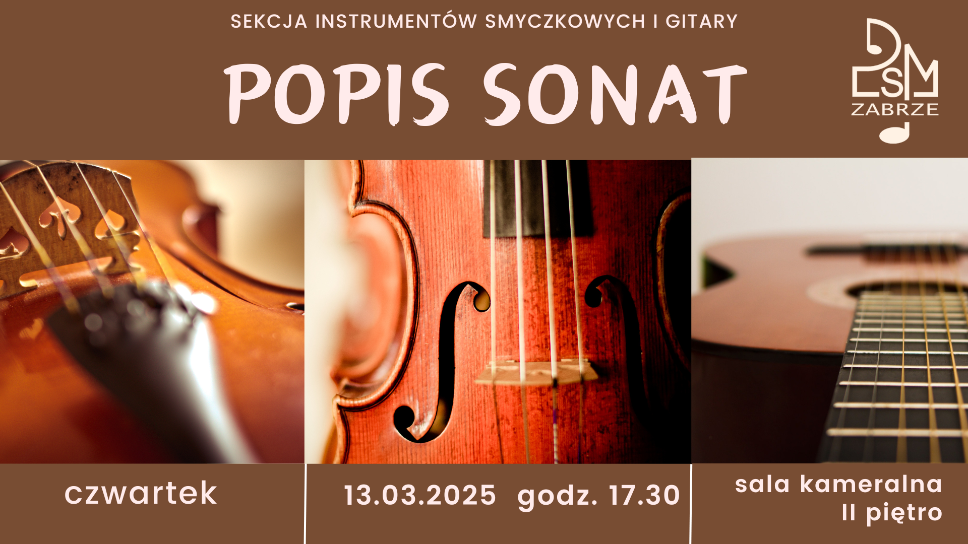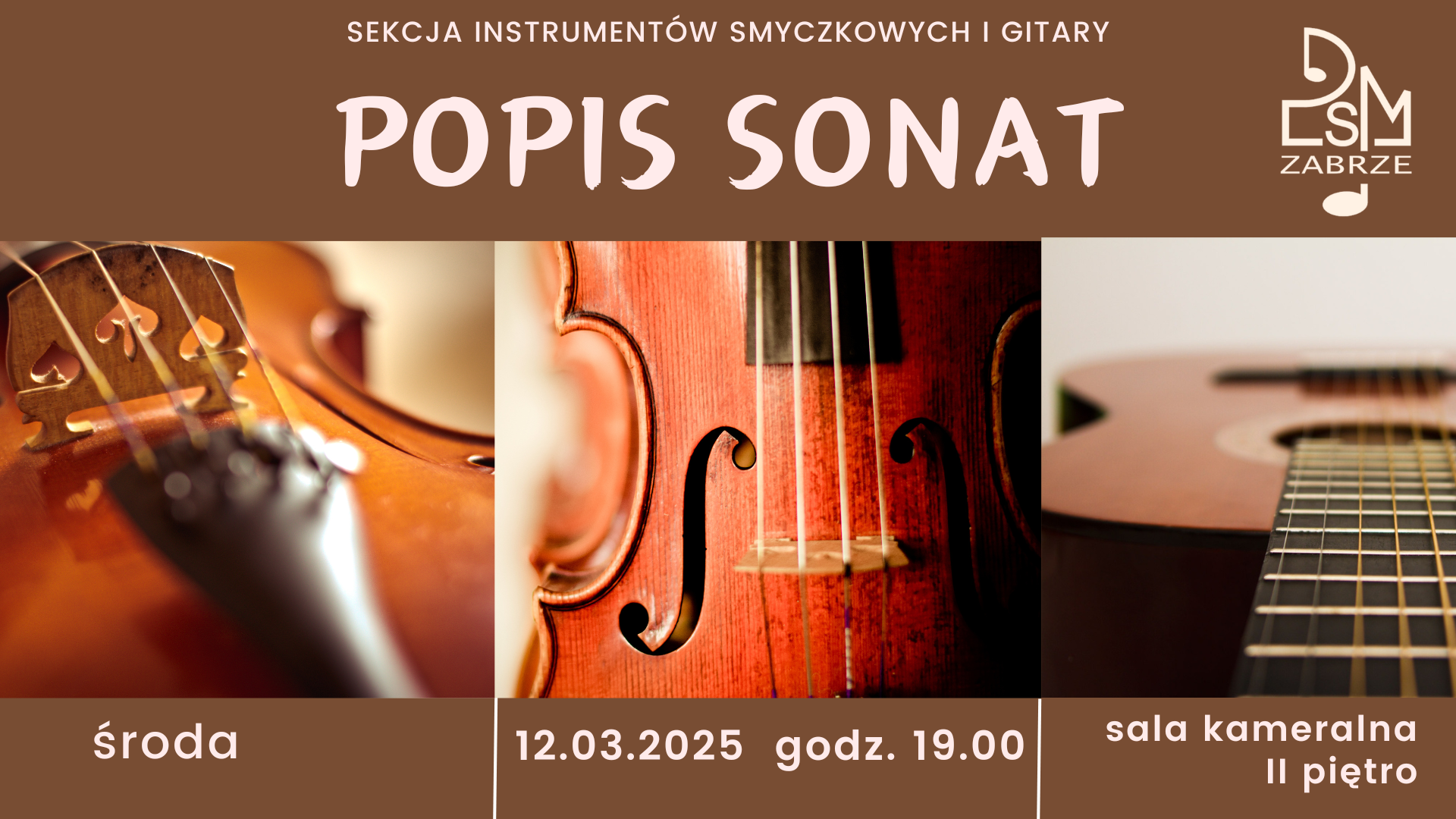 Sekcja instrumentów smyczkowych i gitary zaprasza serdecznie na popisy sonat, które odbędą się w sali kameralnej na II piętrze wg następującego harmonogramu: