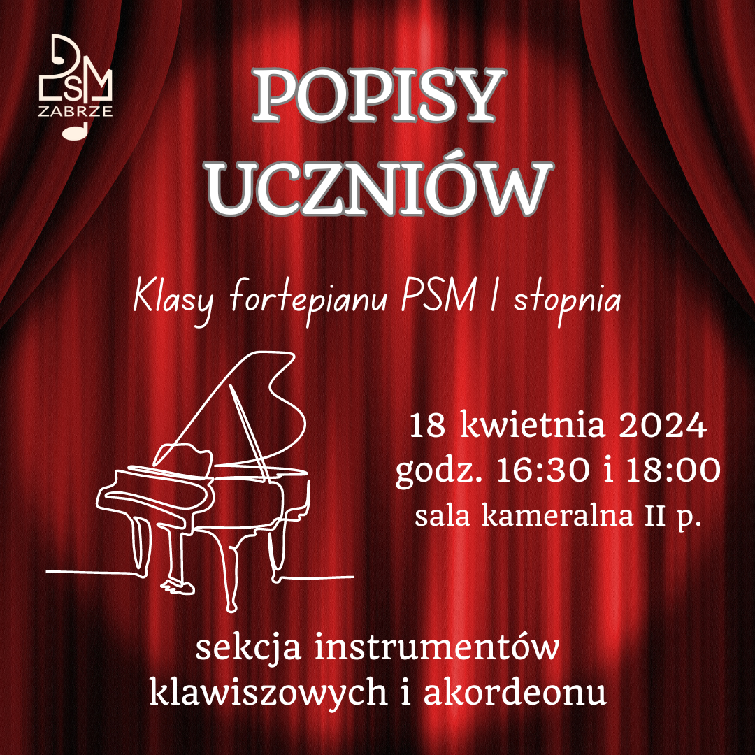 W czwartek, 18 kwietnia o godz. 16.30 oraz 18.00 odbędą się popisy uczniów klasy fortepianu szkoły I stopnia. Zapraszamy do sali kameralnej na II piętrze.