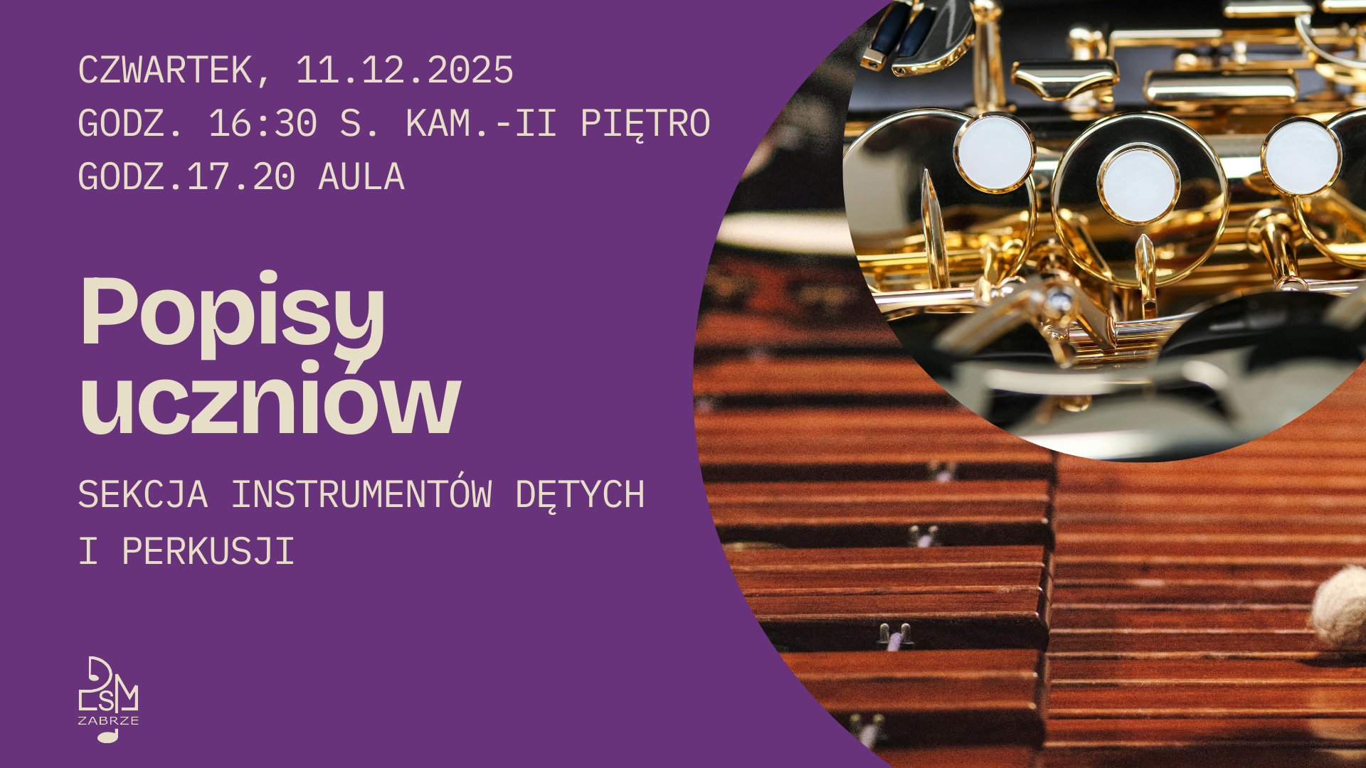 Serdecznie zapraszamy na popisy uczniów sekcji instrumentów dętych i perkusji, które odbędzie się w czwartek, 11 grudnia br. wg następującego planu: