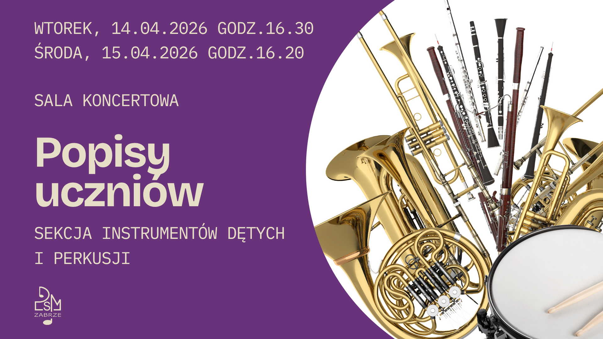 14 kwietnia ( wtorek) o godz. 16.30 i 15 kwietnia (środa) ogodz. 16.20 odbędą się popisy uczniów sekcji instrumentów dętych i perkusji. Serdecznie zapraszamy do Sali Koncertowej.