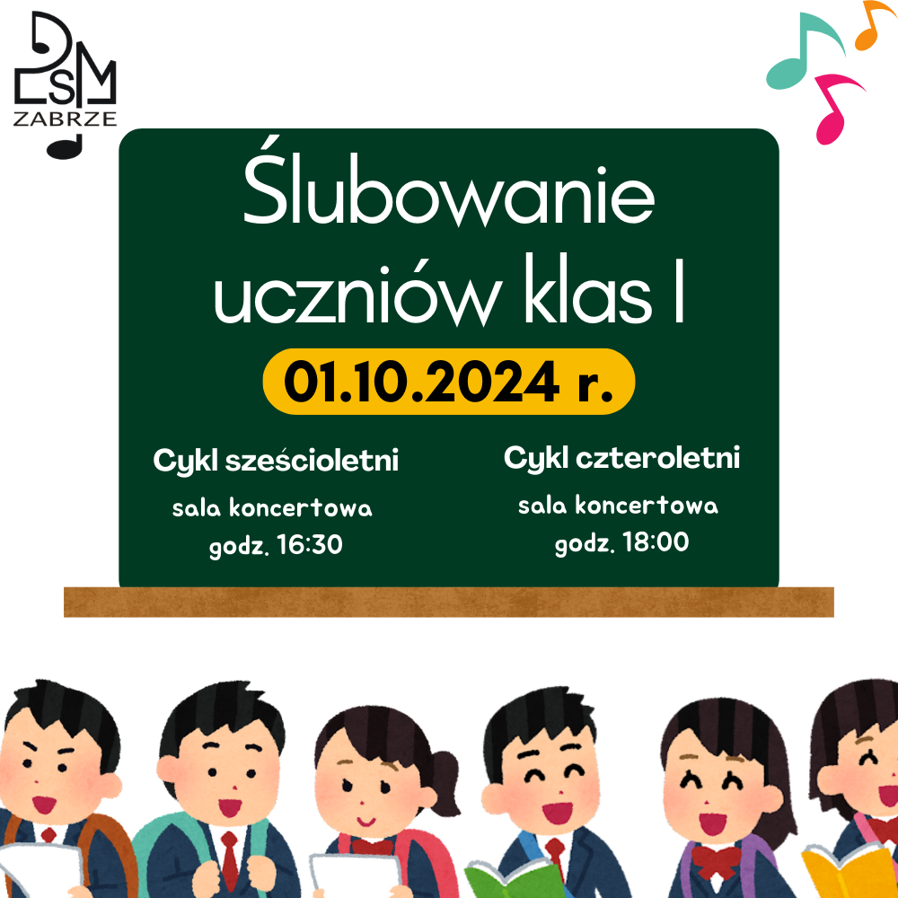 1 października w Międzynarodowym Dniu Muzyki nasi uczniowie klas pierwszych cyklu 6-letniego oraz cyklu 4-letniego szkoły muzycznej I stopnia złożą uroczyste ślubowanie i zostaną pasowani na uczniów naszej szkoły.
