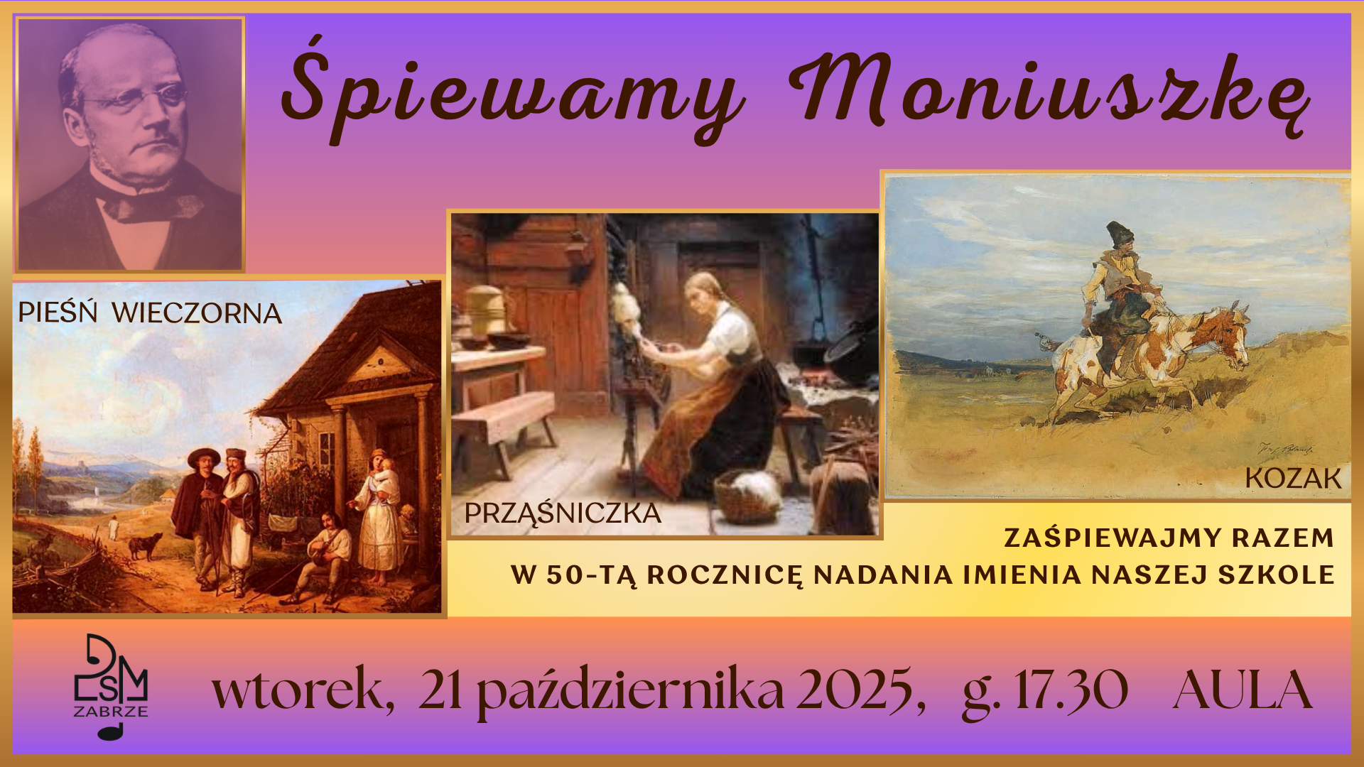 Z okazji 50. rocznicy nadania naszej szkole imienia Stanisława Moniuszki przypadającej dokładnie 21 października, serdecznie zapraszamy uczniów, nauczycieli, rodziców oraz wszystkich przyjaciół szkoły na wspólne śpiewanie pieśni naszego Patrona. Podczas spotkania zaśpiewamy trzy znane utwory Stanisława Moniuszki: Kozaka, Pieśń wieczorną i Prząśniczkę. Nie trzeba się wcześniej przygotowywać – na miejscu każdy otrzyma okolicznościowy śpiewnik zawierający teksty z zapisem nutowym.