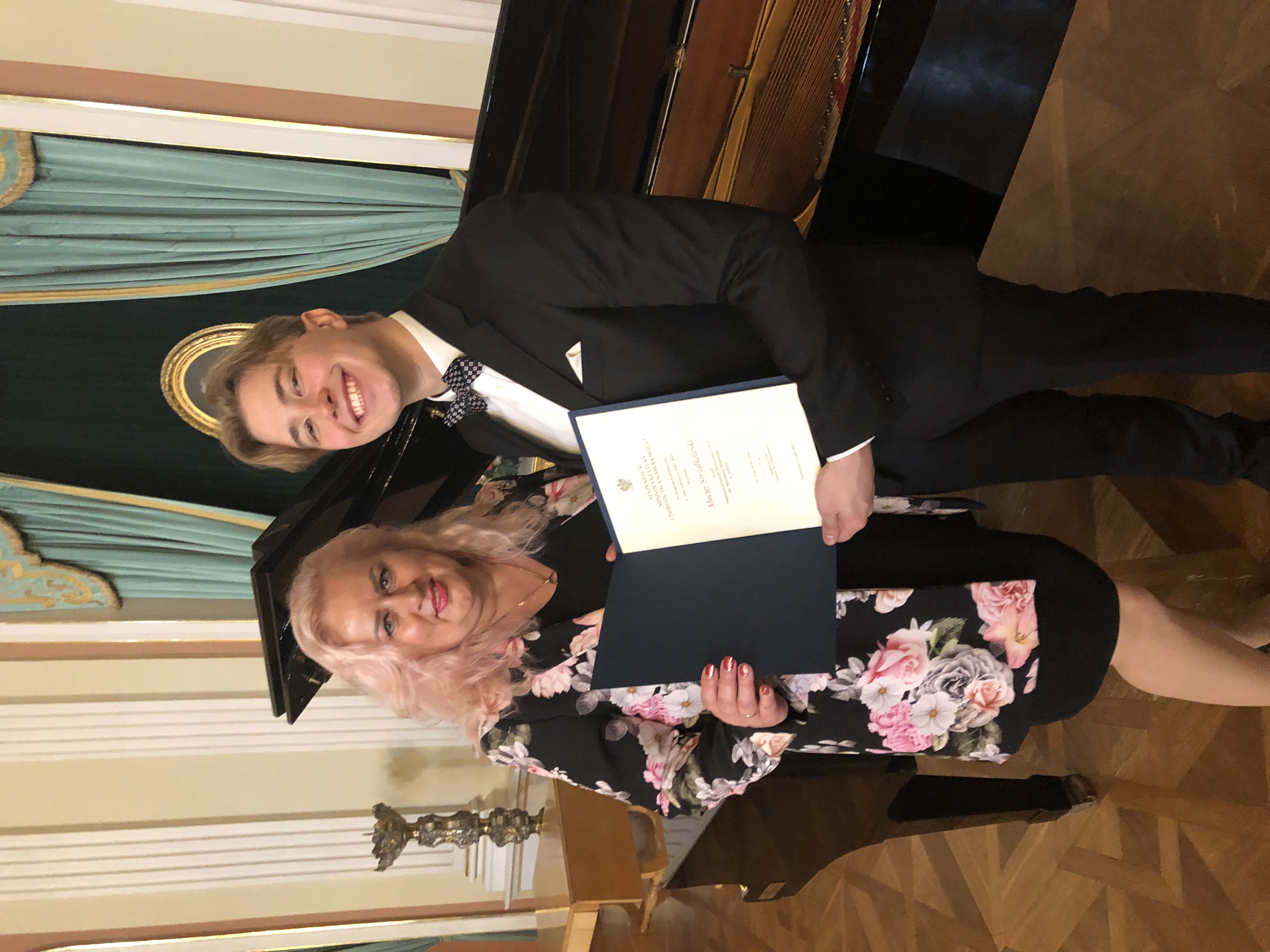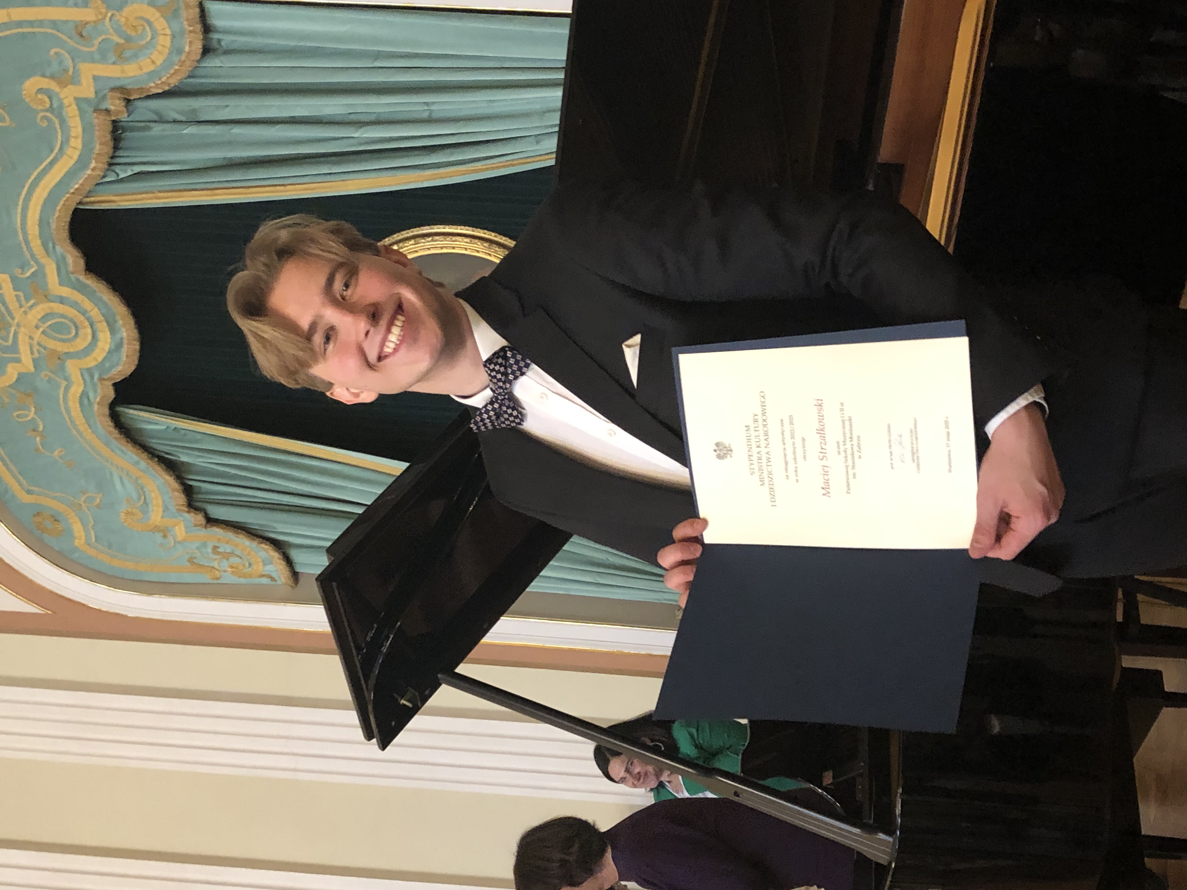 Dnia 17 maja 2023 r. w sali balowej Zamku Królewskiego w Warszawie odbyła się uroczystość wręczenia stypendiów Ministra Kultury i Dziedzictwa Narodowego za osiągnięcia artystyczne w roku szkolnym 2022/2023. Stypednia wręczał dyrektor Departamentu Szkonictwa Artystycznego w MKiDN Pan Jarosław Wartak. W gronie wyróżnionych znalazł się nasz uczeń klasy śpiewu Pani Małgorzaty Strąg Maciej Strzałkowski. W galerii poniżej znajduje się kilka pamiątkowych zdjęć z uroczystości wręczenia stypendiów.