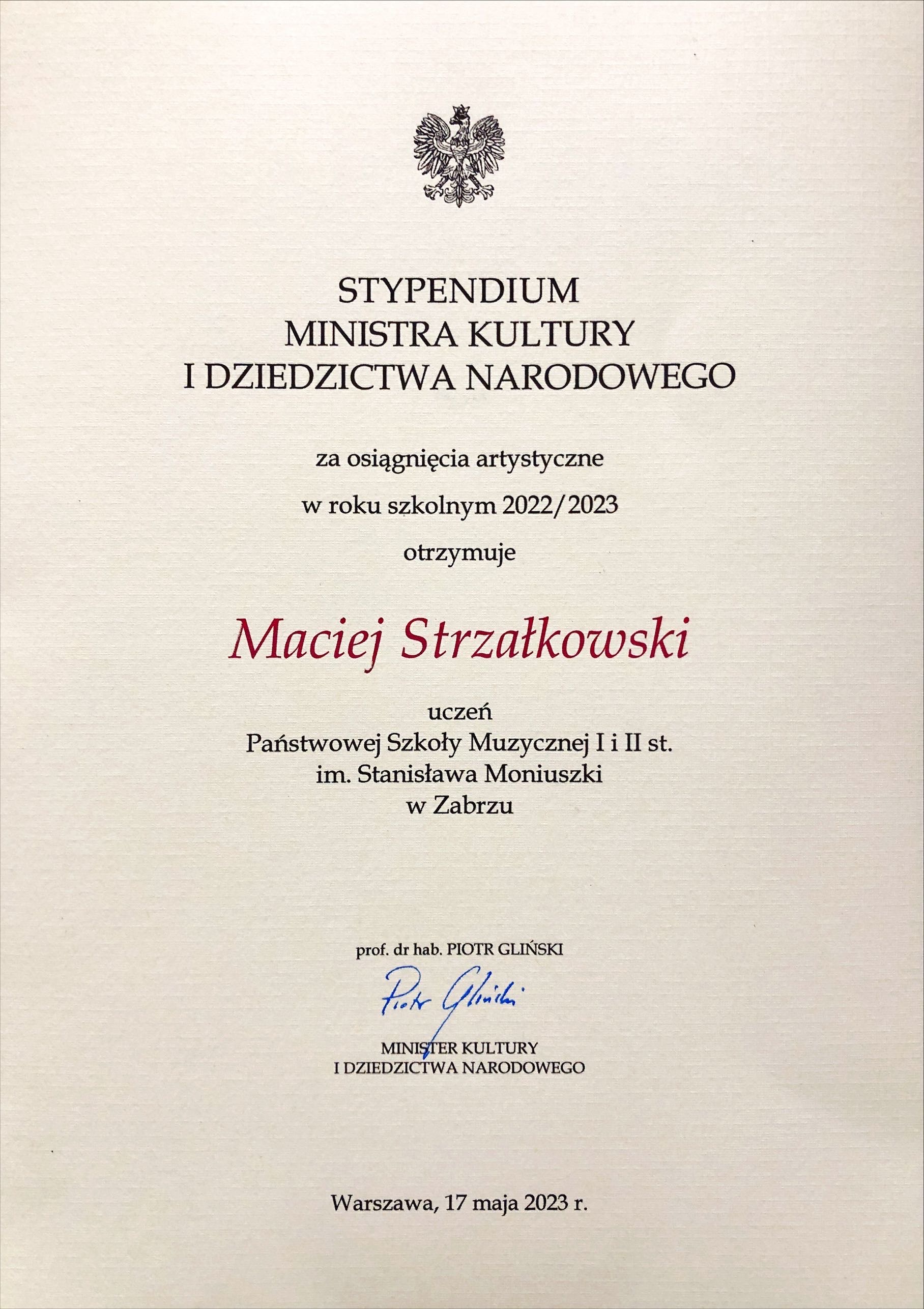 Stypendium Ministra Kultury za osiągnięcia artystyczne dla ucznia naszej szkoły