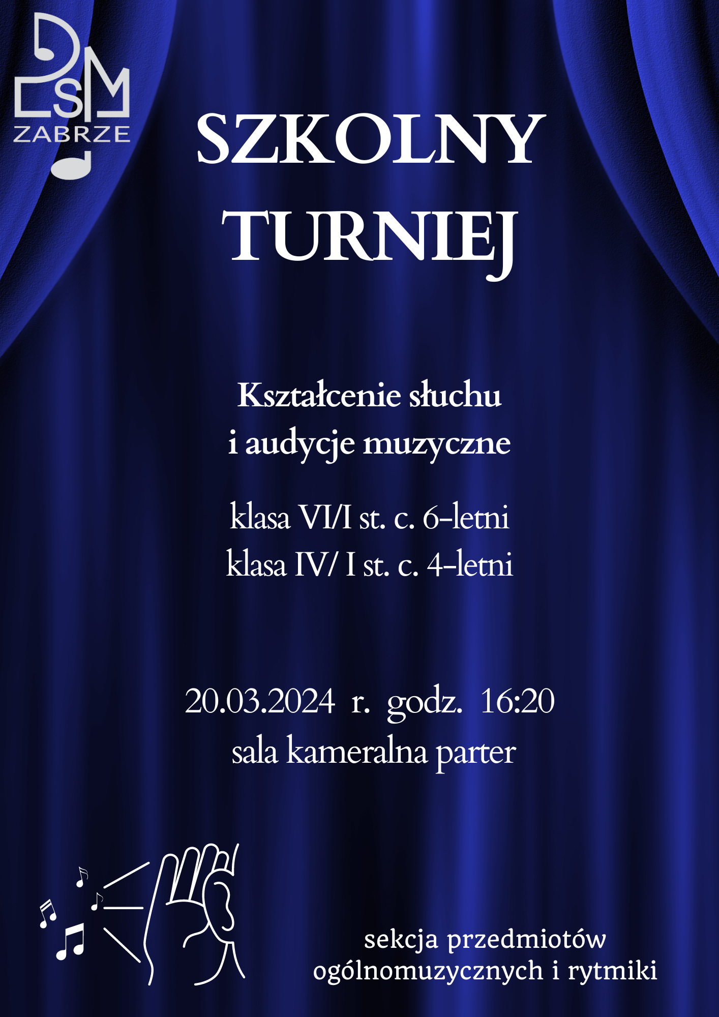 W środę, 20 marca 2024 roku o godzinie 16.20 w sali kameralnej na parterze odbędzie się Szkolny Turniej z Kształcenia Słuchu i Audycji Muzycznych. Serdecznie zapraszamy do udziału uczniów klas VI cyklu 6-letniego oraz klas IV cyklu 4-letniego. Powodzenia!