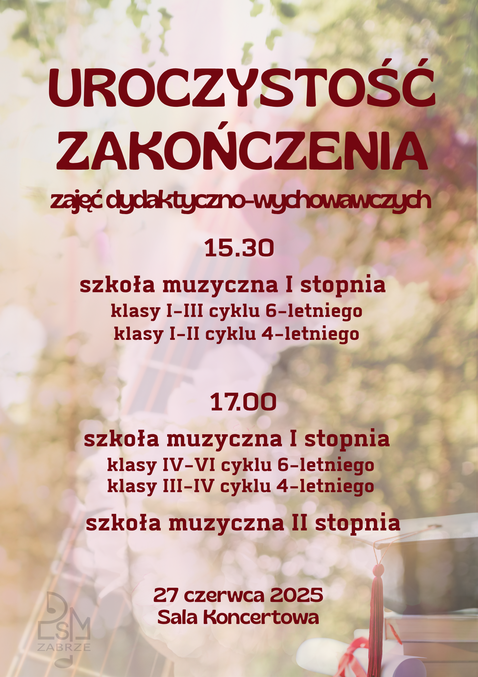 O godz. 17.00 odbędzie się zakończenie klas IV-VI cykl 6-letniego, klas III-IV cyklu 4-letniego szkoły muzycznej I stopnia oraz wszystkich klas szkoły muzycznej II stopnia.