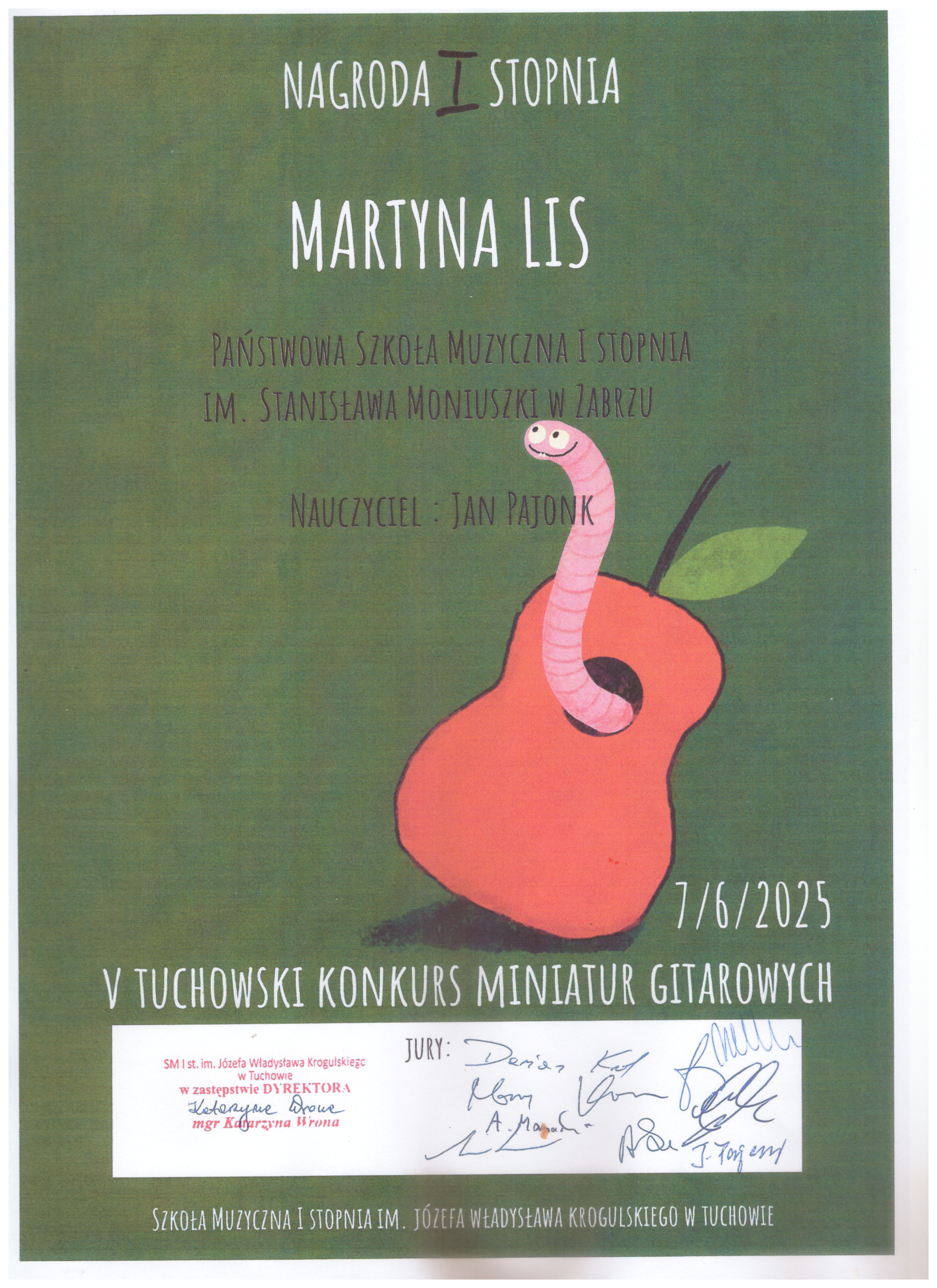 Informujemy, że Martyna Lis zdobyła nagrodę I st. w V Tuchowskim Konkursie Miniatur Gitarowych w dn. 7.06.2025 r. w Tuchowie. Gratulujemy sukcesu i dziękujemy Panu Janowi Pajonkowi za przygotowanie naszego laureata!