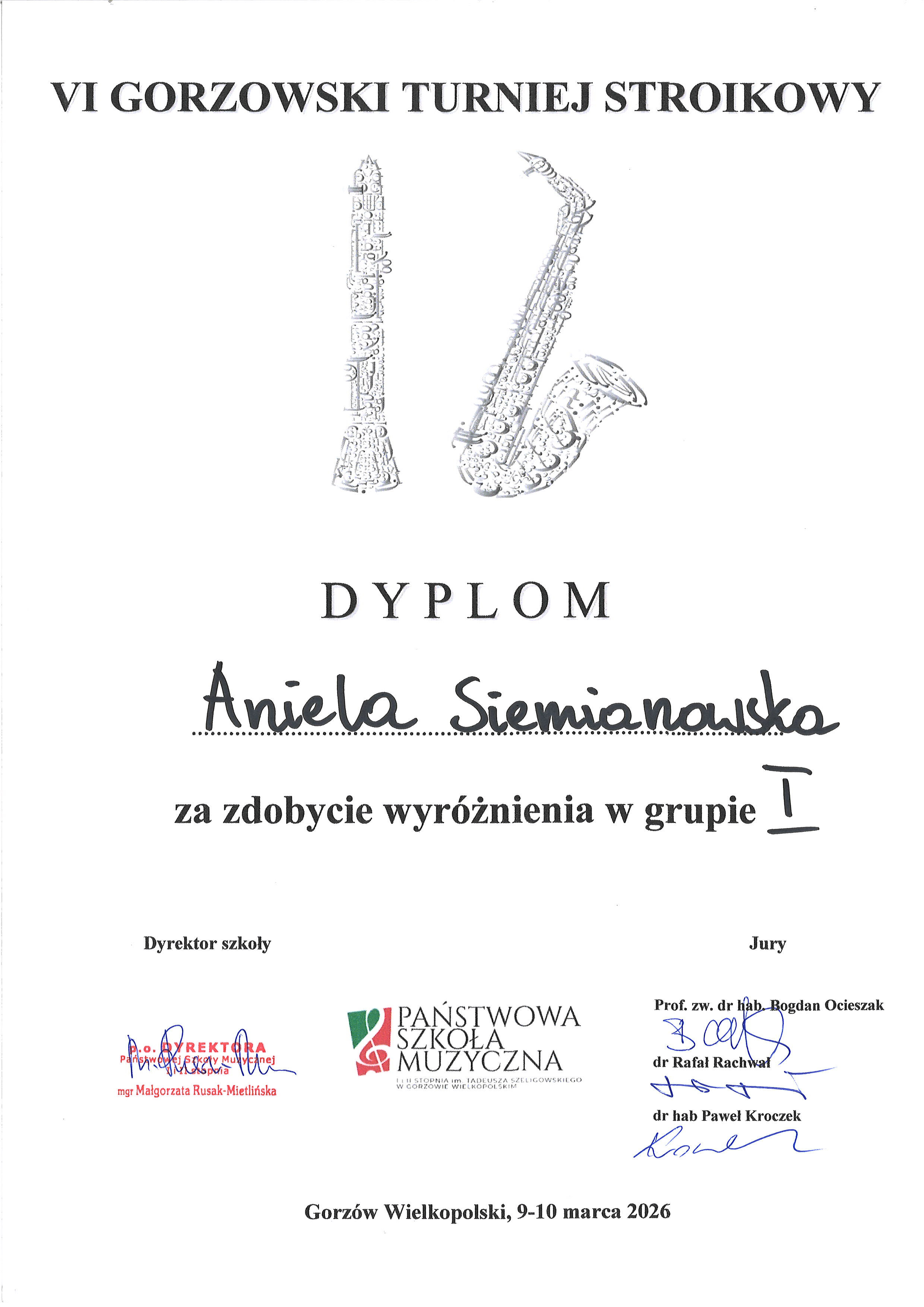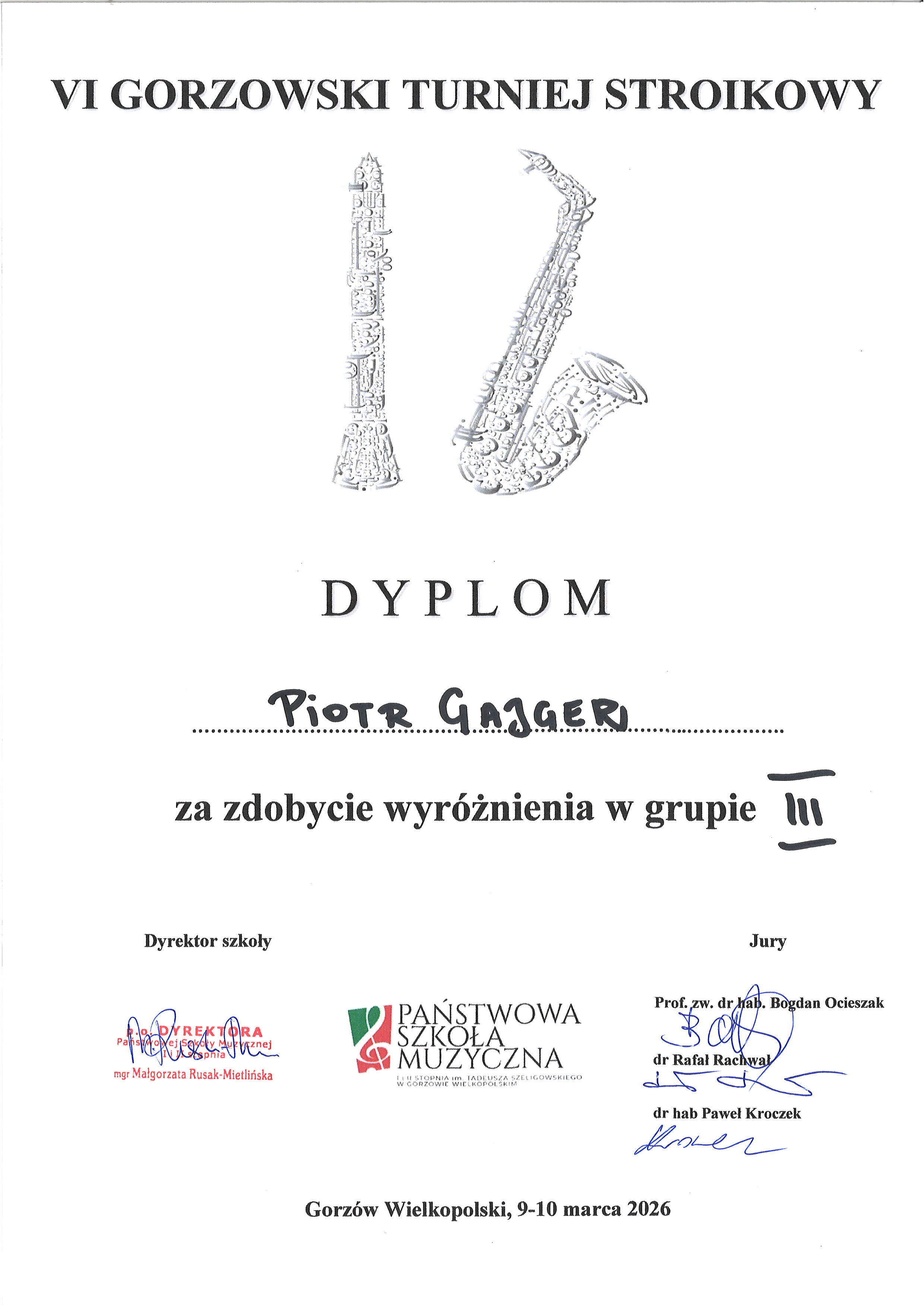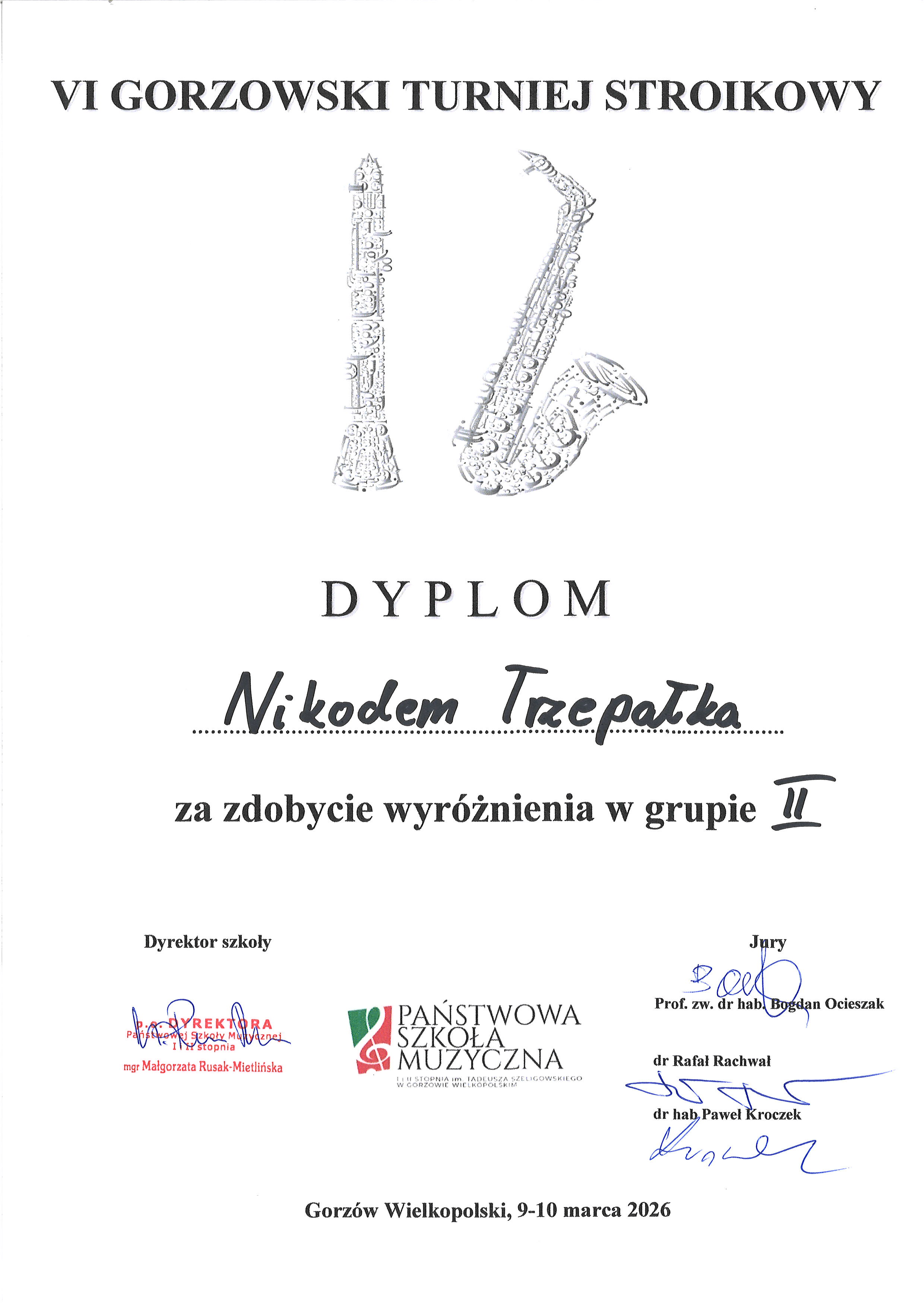 Z wielką przyjemnością informujemy, że w VI Gorzowskim Turnieju Stroikowym organizowanym w dn. 9-10 marca 2026 r. w Gorzowie Wielkopolskim laury zdobyli następujący uczniowie: