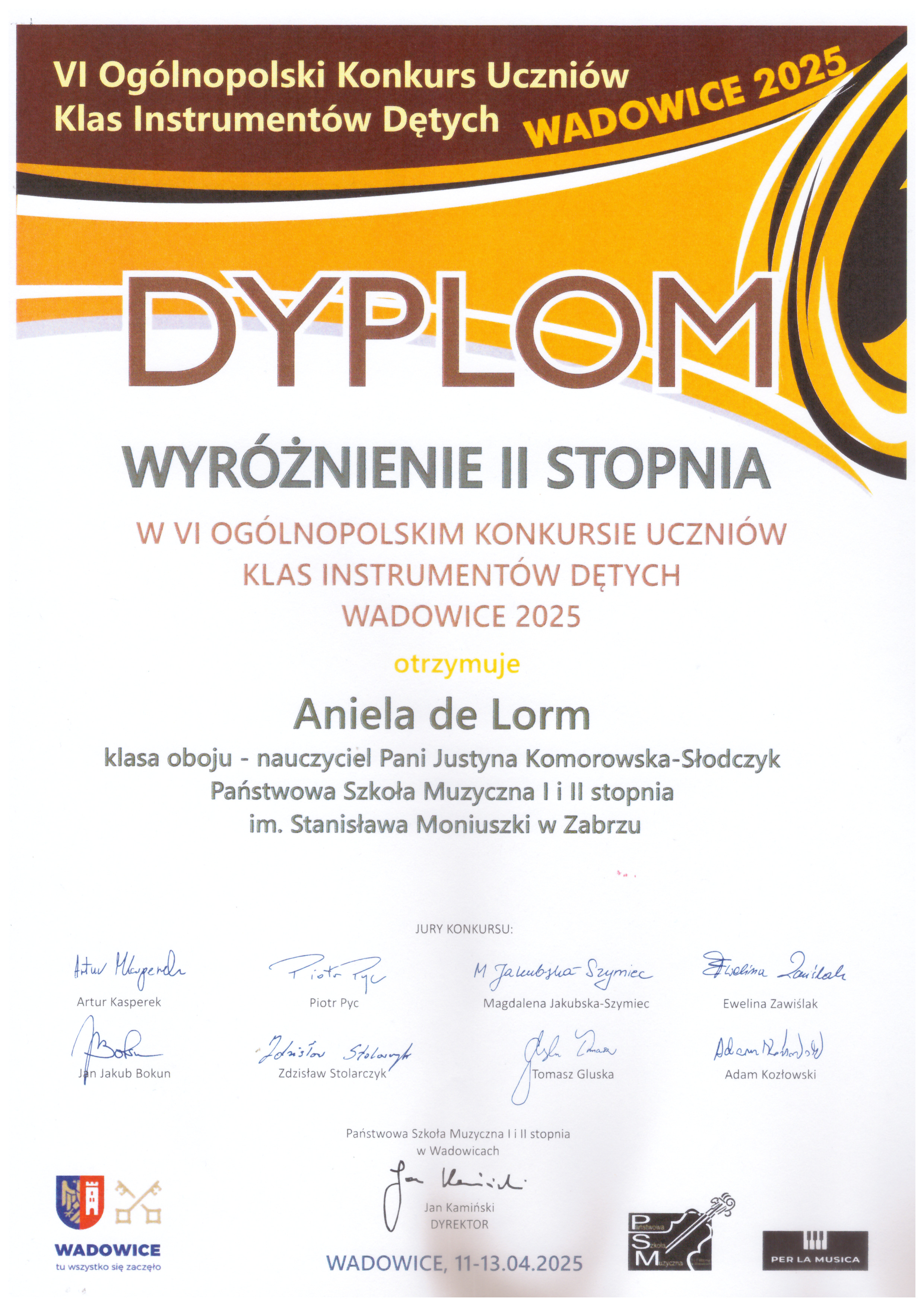 Informujemy, że Aniela De Lorm zdobyła wyróżnienie II stopnia w VI Ogólnopolskim Konkursie Uczniów Klas Instrumentów Dętych organizowanym w dniach 11-13 kwietnia 2025 r. w Wadowicach. Gratulujemy sukcesu i dziękujemy Pani Justynie Komorowskiej-Słodczyk za przygotowanie naszego laureata oraz Pani Agacie Uran za akompaniament!