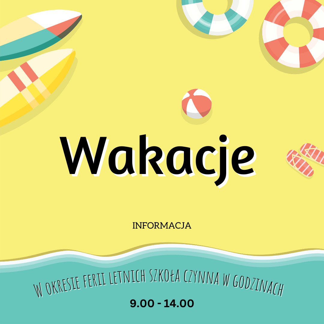 Informujemy, że w okresie wakacji szkoła jest czynna w godzinach 9.00 -14.00.