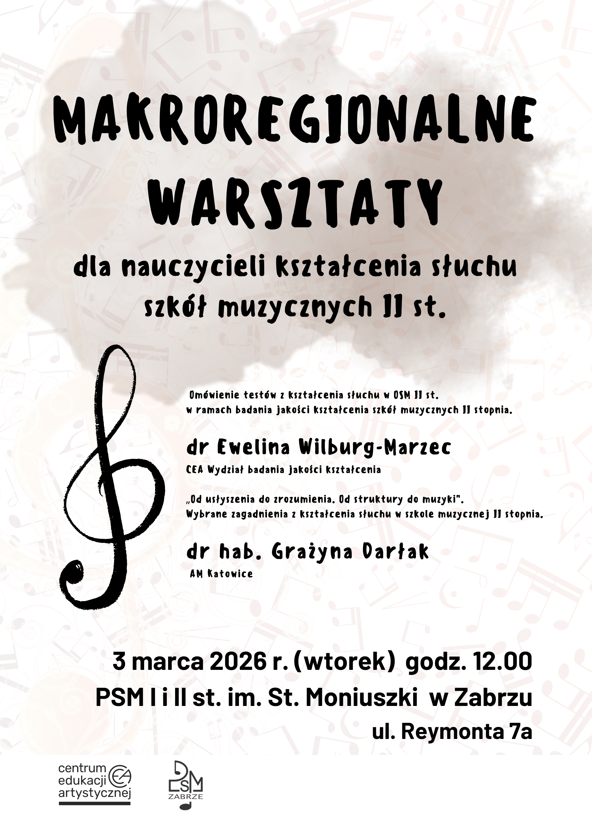 Centrum Edukacji Artystycznej w Katowicach oraz Państwowa Szkoła Muzyczna I i II stopnia im. St. Moniuszki w Zabrzu zapraszają nauczycieli kształcenia słuchu szkół muzycznych II st. na warsztaty w ramach podnoszenia poziomu kształcenia artystycznego w zakresie doskonalenia zawodowego nauczycieli. Szczegóły na plakacie.