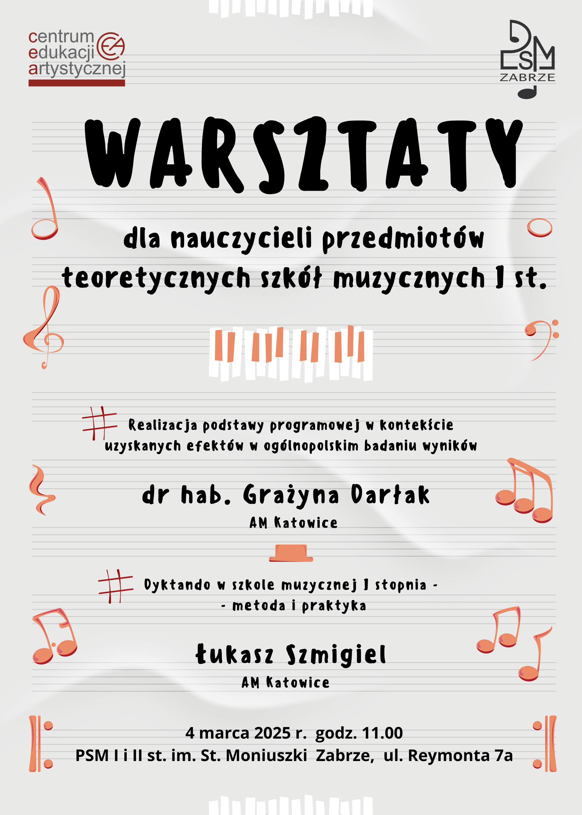 Centrum Edukacji Artystycznej w Katowicach oraz Państwowa Szkoła Muzyczna I i II stopnia im. St. Moniuszki w Zabrzu zapraszają nauczycieli przedmiotów teoretycznych szkół muzycznych I st. na warsztaty w ramach podnoszenia poziomu kształcenia artystycznego w zakresie doskonalenia zawodowego nauczycieli. Szczegóły na plakacie.