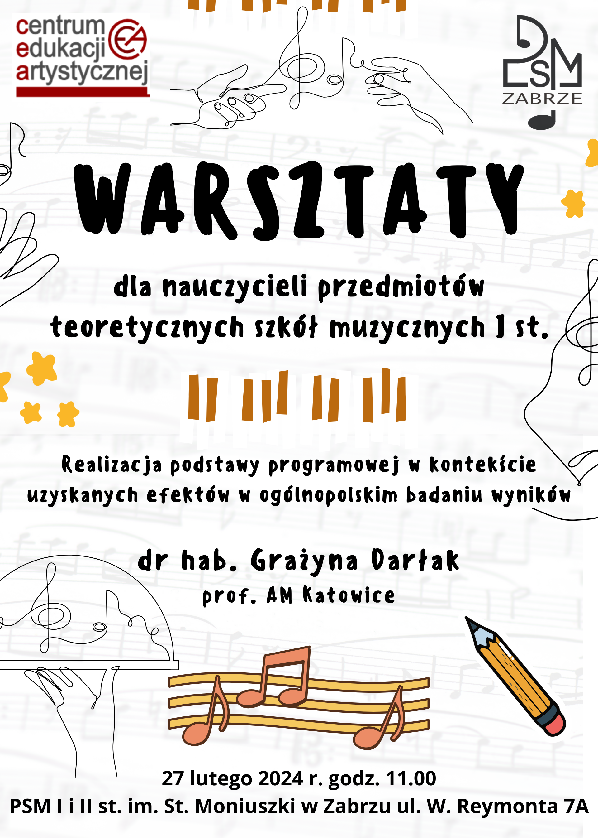 Centrum Edukacji Artystycznej w Katowicach oraz Państwowa Szkoła Muzyczna I i II stopnia im. St. Moniuszki w Zabrzu zapraszają nauczycieli przedmiotów teoretycznych szkół muzycznych I st. na warsztaty w ramach podnoszenia poziomu kształcenia artystycznego w zakresie doskonalenia zawodowego nauczycieli. Szczegóły na plakacie. Serdecznie zapraszamy do Zabrza! Do zobaczenia we wtorek 27.02.2024 r.