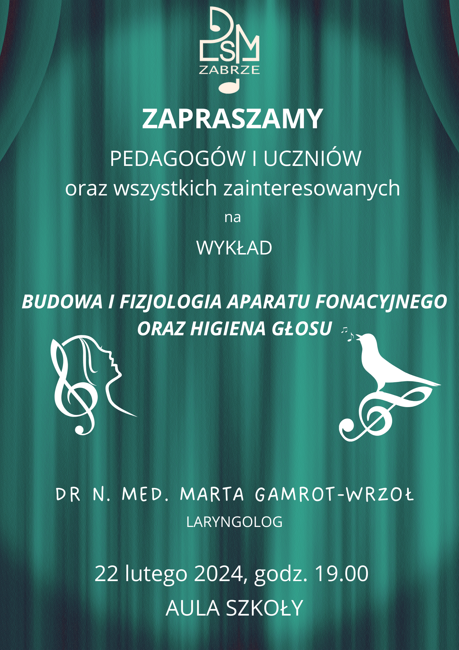 Serdecznie zapraszamy wszystkich chętnych na wykład dr n. med. Marty Gamrot-Wrzoł. pt. Budowa i fizjologia aparatu fonacyjnego oraz higiena głosu Wykład odbędzie się w auli szkoły, w czwartek, 22 lutego 2024 roku o godz. 19.00