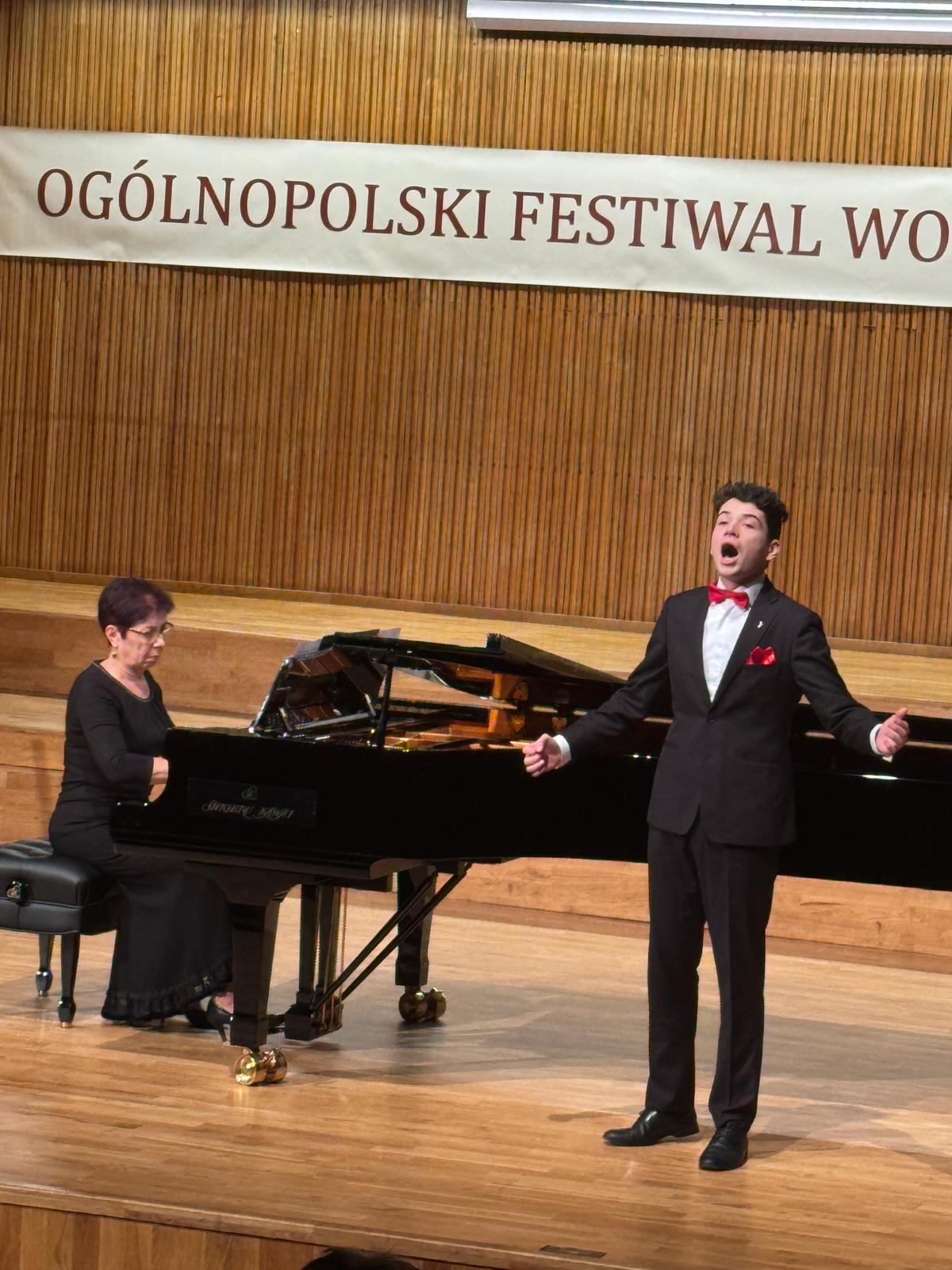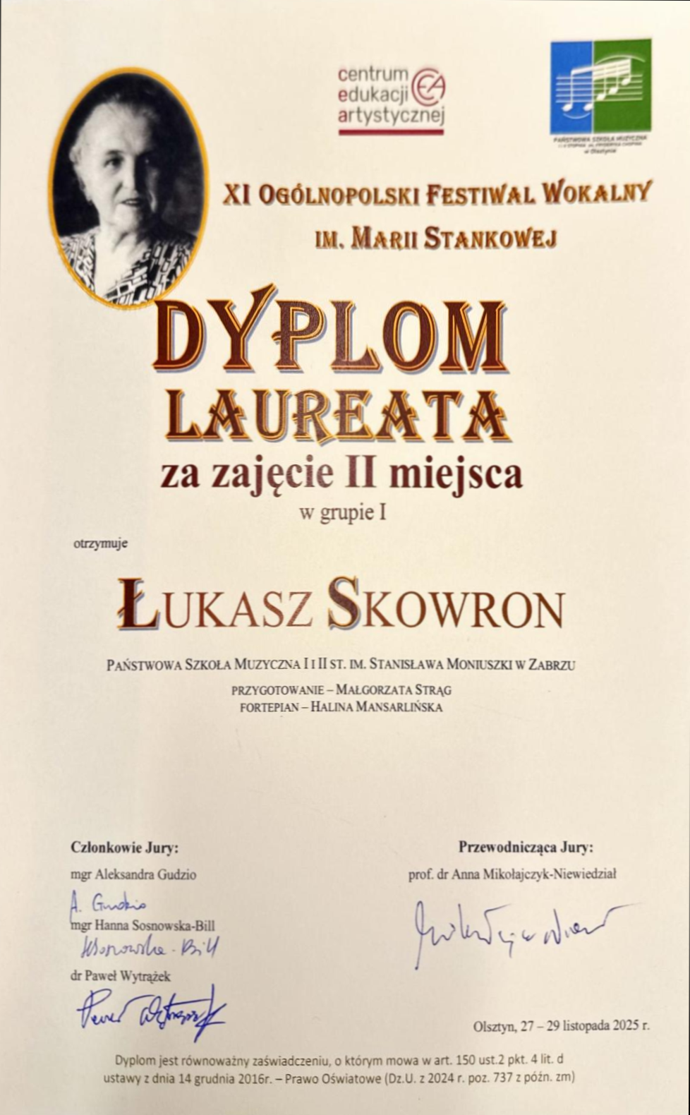Z wielką radością informujemy, że podczas XI Ogólnopolskiego Festiwalu Wokalnego im. Marii Stankowej, który odbył się w dniach 27 - 29 listopada 2025 roku w Olsztynie, Łukasz Skowron z klasy Pani Małgorzaty Strąg uzyskał DYPLOM LAUREATA za zdobycie II miejsca w grupie I. Uczniowi akompaniowała Pani Halina Mansarlińska.