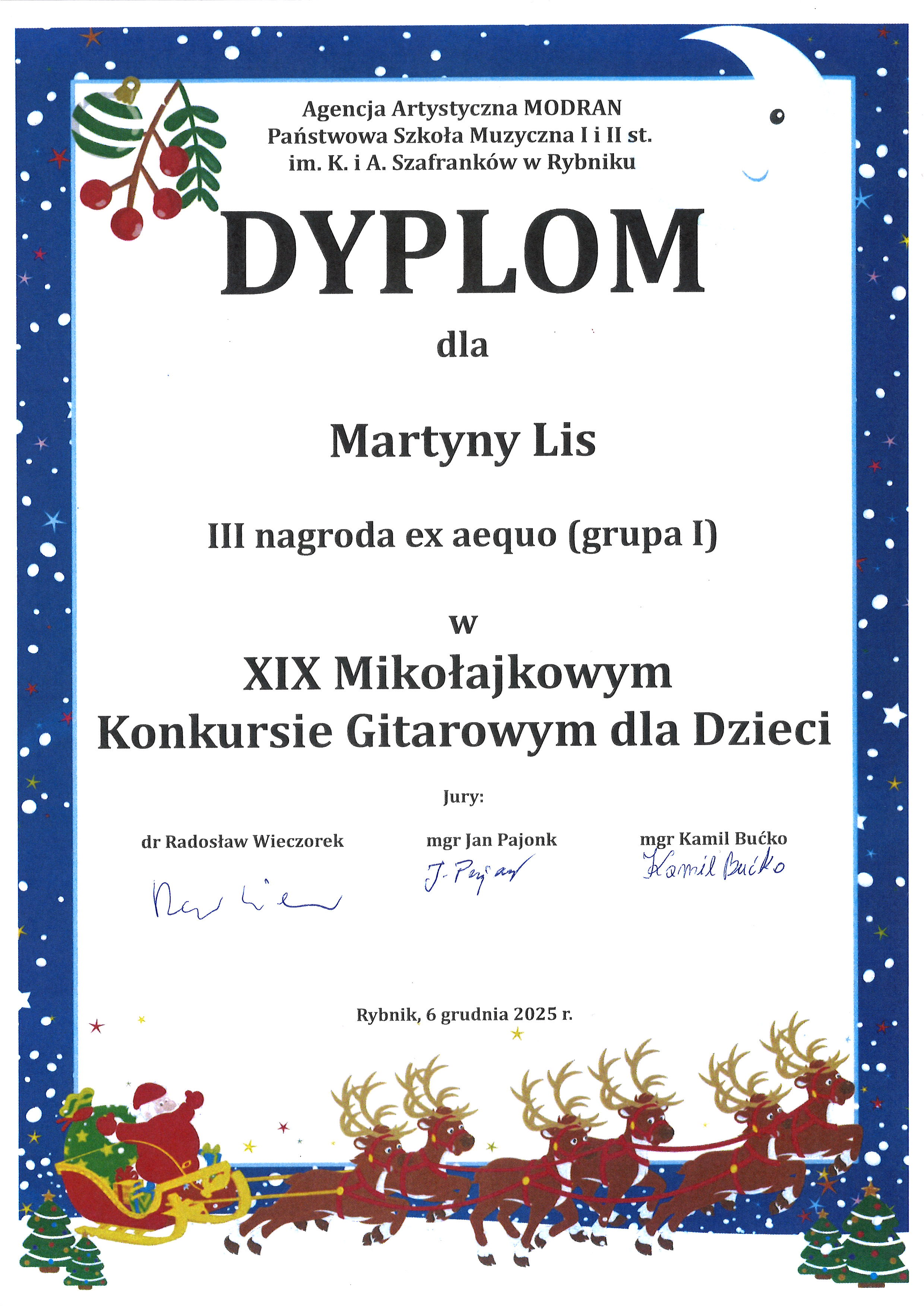 Z radością informujemy o kolejnym sukcesie naszych uczniów - w XIX Mikołajkowym Konkursie Gitarowym dla Dzieci, który odbył się 6 grudnia 2025 r. w Państwowej Szkole Muzycznej I i II stopnia im. Karola i Antoniego Szafranków w Rybniku, Martyna Lis z klasy II cyklu 6-letniego zdobyła III miejsce w grupie I. Martyna jest uczennicą klasy gitary Pana Jana Pajonka.